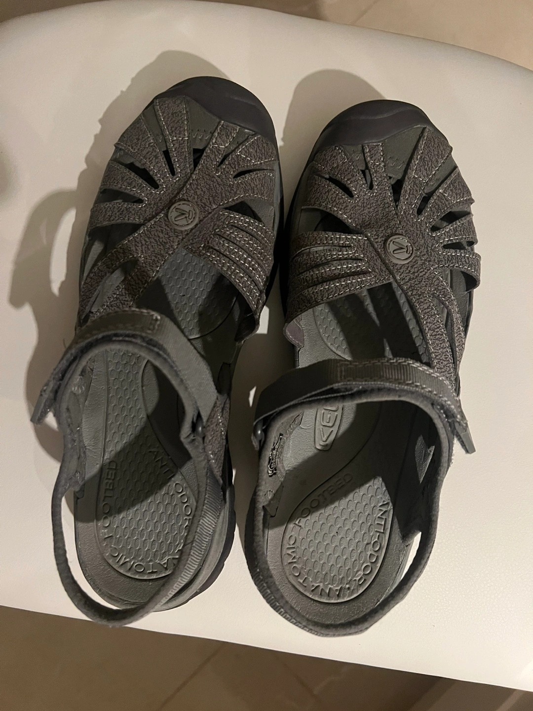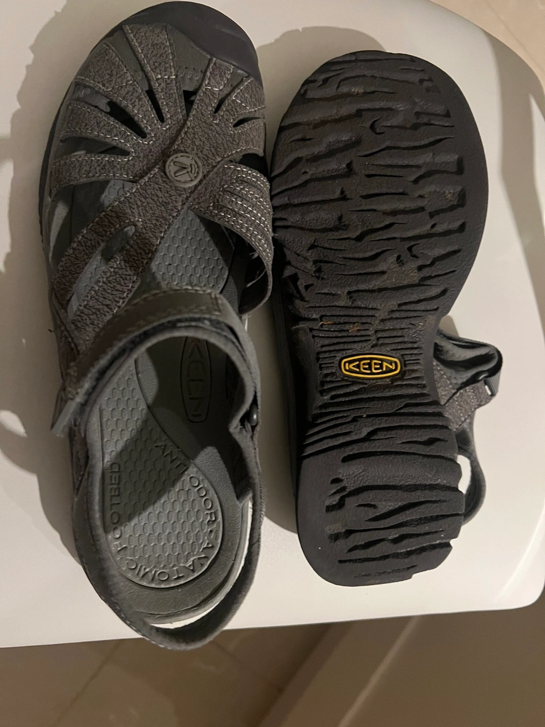 I'm selling a pair of KEEN women's sandals in a lovely grey colour! They're in great condition and ready for a new home. These are a size 9 but fit big and would be perfect for summer outings or just kicking around town. Let me know if you're interested!