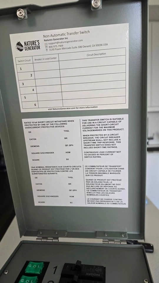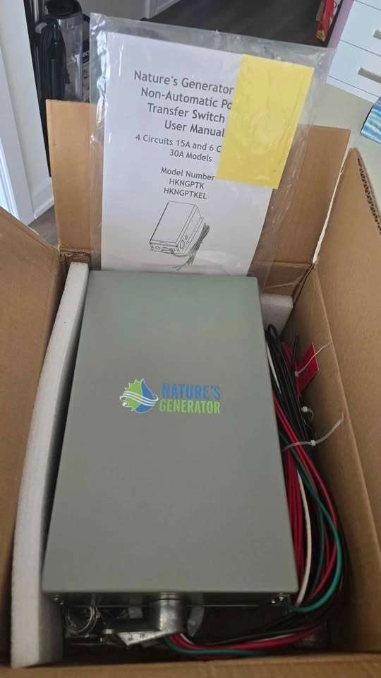 Nature’s Generator 6-Circuit Manual Transfer Switch – 120V/30A Features: - 6-circuit transfer switch, complete kit included - L5-30P inlet for easy generator connection - Illuminated rocker switch lights up in generator mode - Quick indoor installation - Ideal for homes, offices, or small businesses Pickup in Oakville