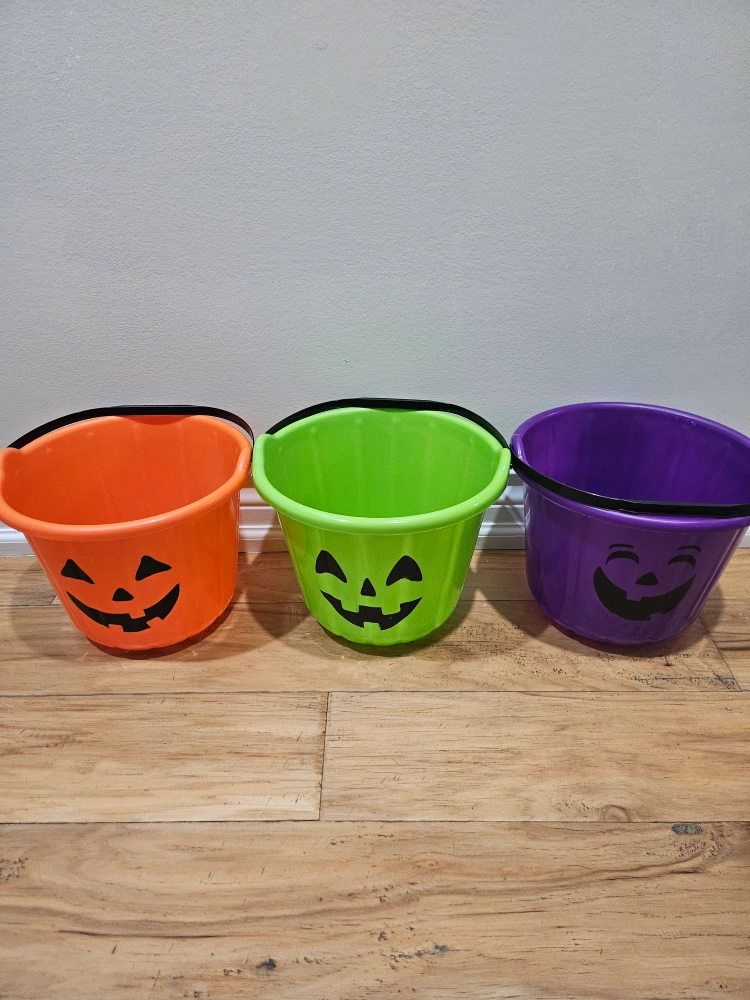 Get ready for Halloween with these fun pumpkin candy buckets! This set includes three buckets in orange, green, and purple, each with a cute jack-o'-lantern face. Perfect for trick-or-treating or Halloween decorations!