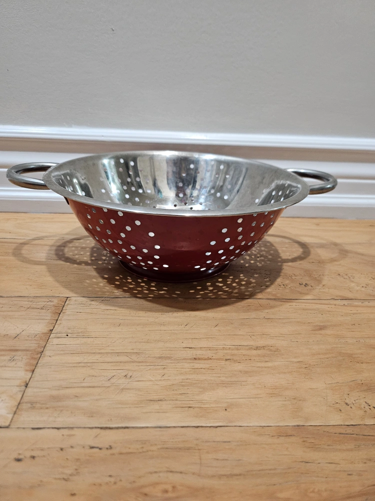 Selling a red colander with silver-tone handles. It's in good condition and ready for a new home! Perfect for draining pasta or washing veggies. It has a nice, sturdy build.