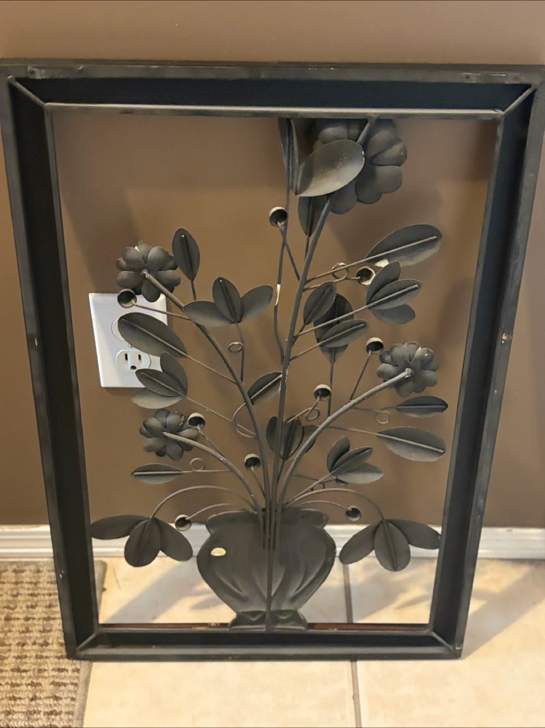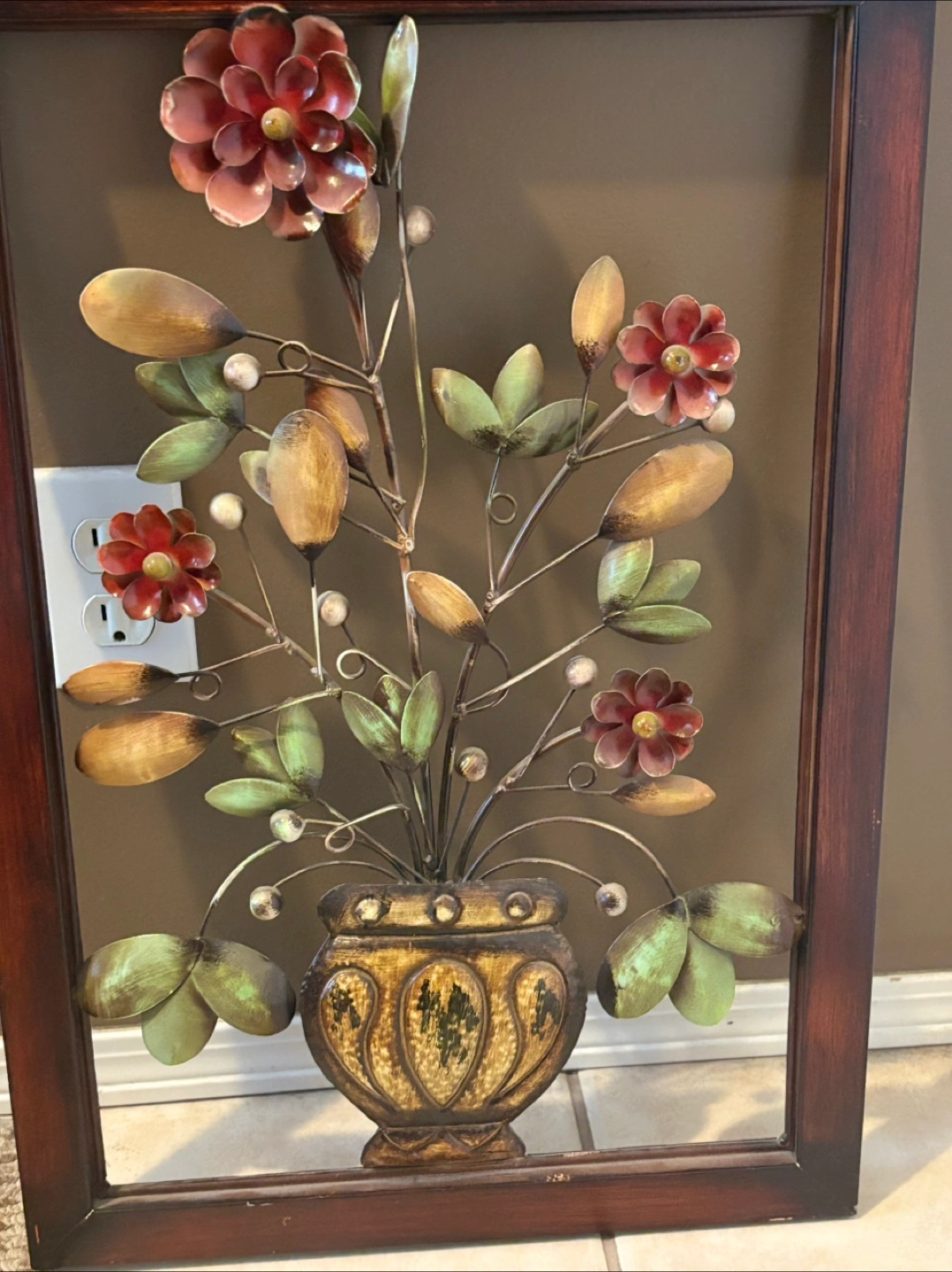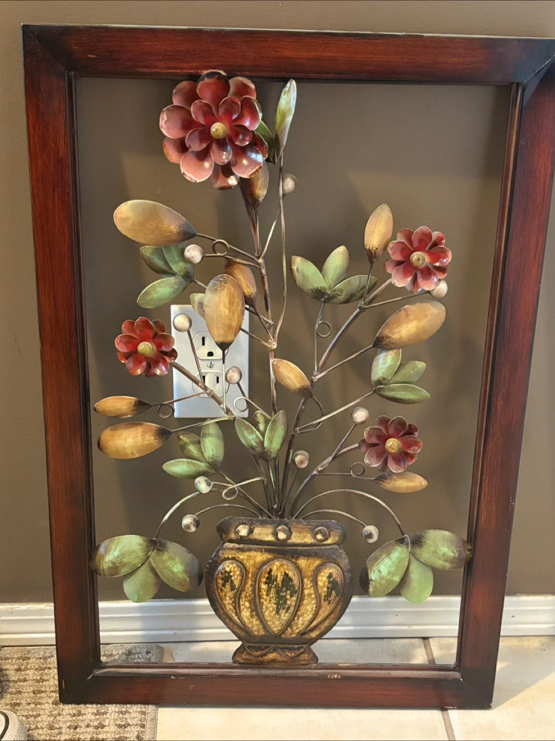 Add a touch of floral charm to your home with this framed metal flower wall art! The piece features a vase with flowers and leaves in a framed setting. It's in great condition and ready to brighten up any room in your home