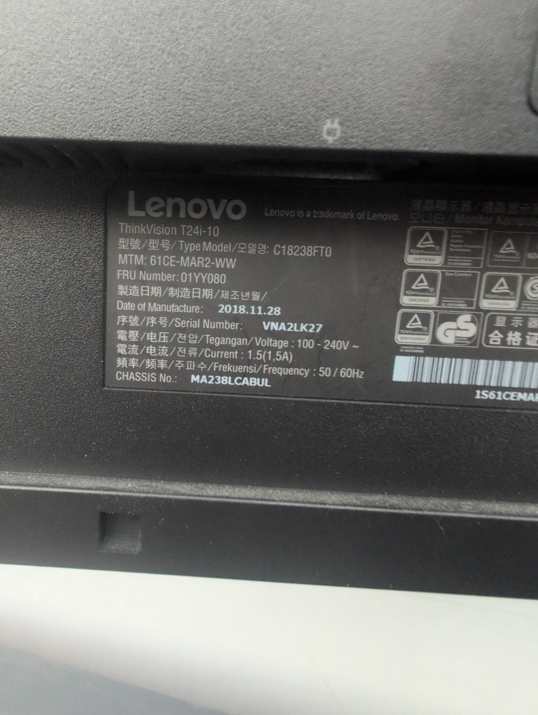 Selling a Lenovo ThinkVision T24i-10 monitor. It's in great shape and ready for a new home! The model number is C18238FT0 and the manufacturing date is 2018 November 28
