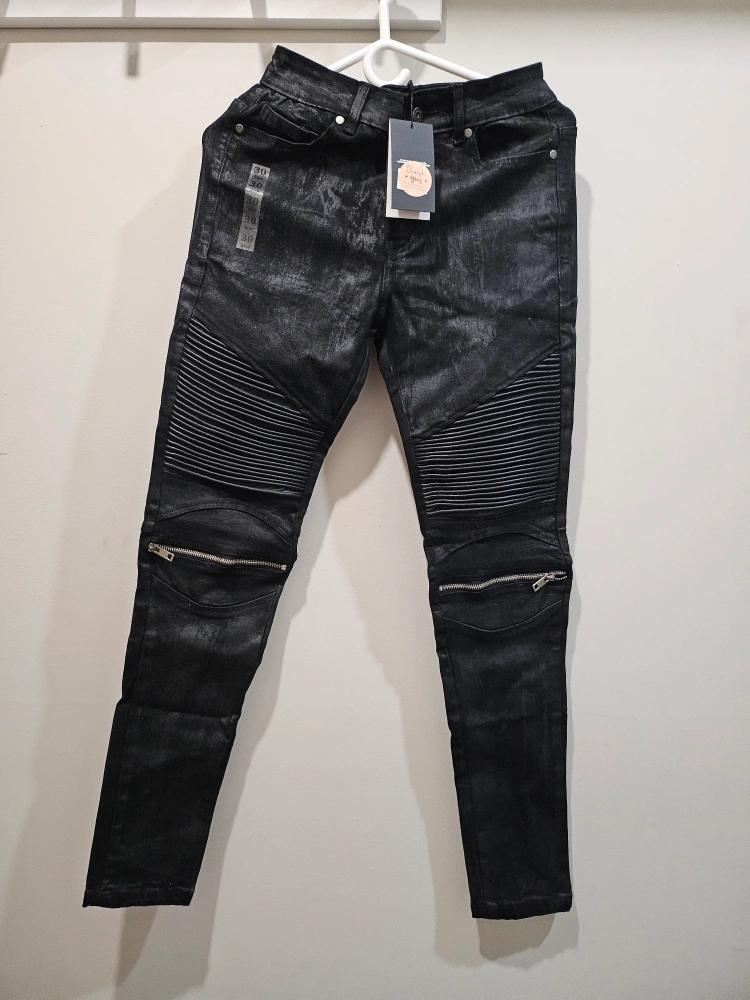 Here are some black biker jeans from Vivid Options! They are size 30 and feature a stylish design with zippers on the knees. Perfect for adding an edgy touch to your wardrobe!