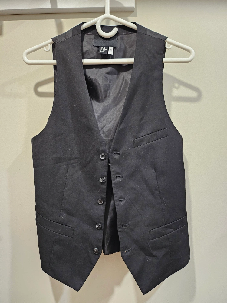 Selling a black vest from H&M! It's a size small and in great condition. Perfect for layering or dressing up an outfit. It has a classic design with button closure and functional pockets. A versatile piece to add to your wardrobe