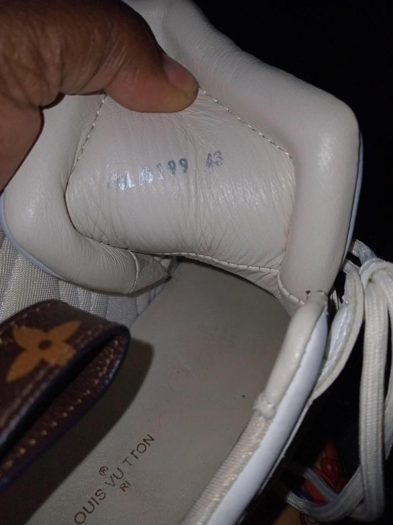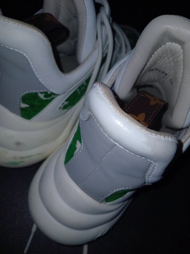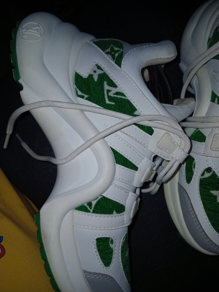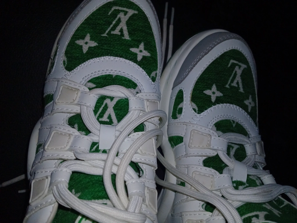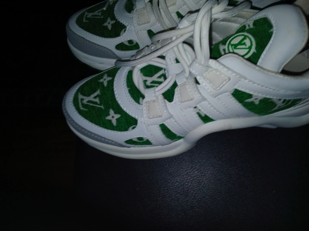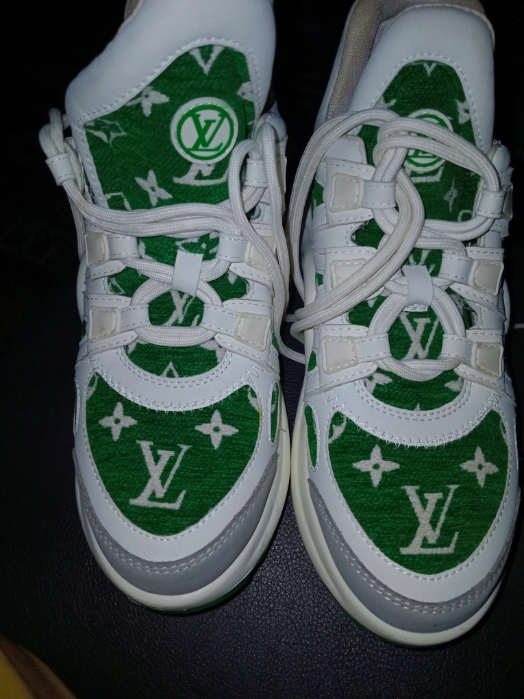 Selling a pair of Louis Vuitton sneakers in green and white. The size is 43 (European sizing). They have the classic LV logo pattern. Stylish and comfortable!