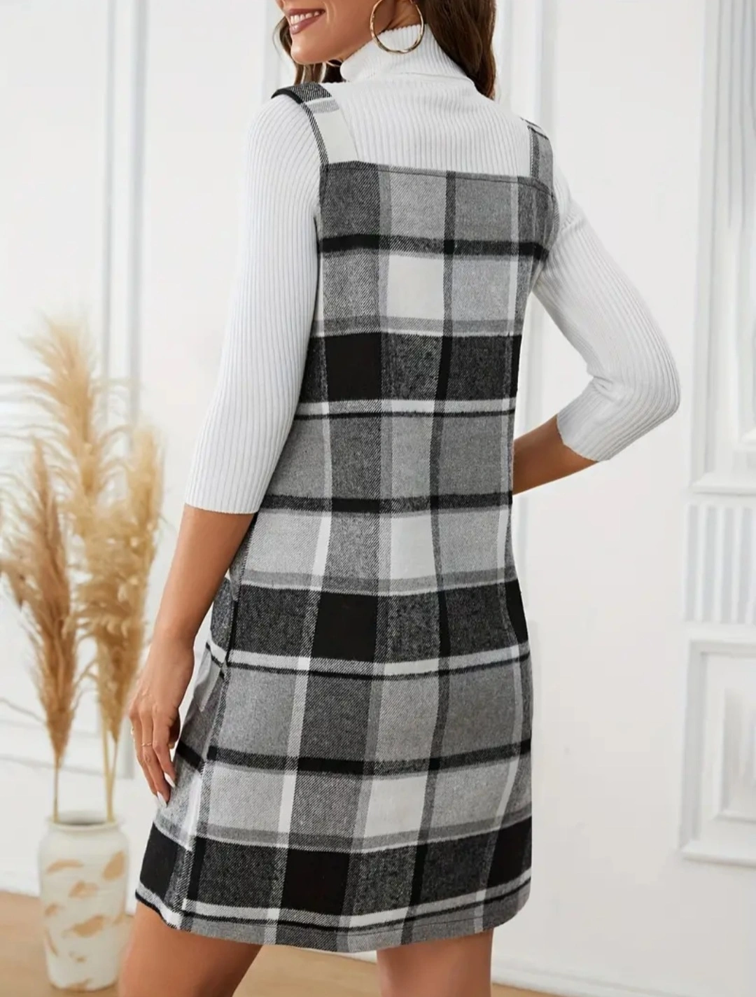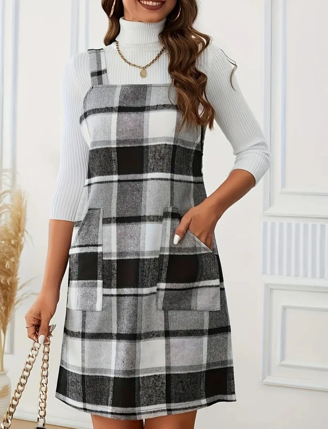 This cute plaid overall dress is perfect for layering! It's in great condition.. The black and white pattern is super versatile, and it has handy pockets