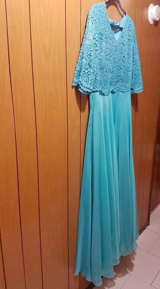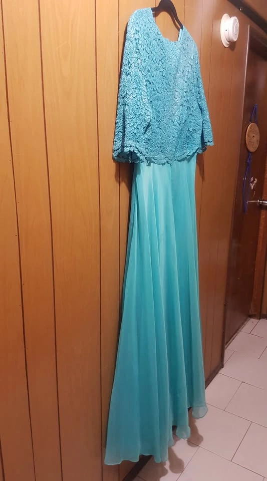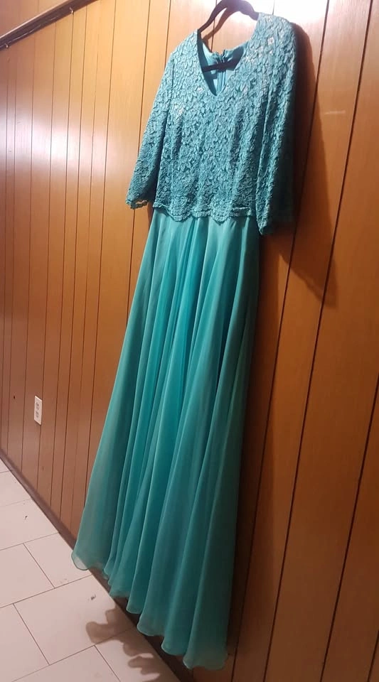 Appropriate for Prom, attending a wedding, and any other occasion. Blue A-line Gown dress with beautiful blue bodice. Top of gown has a blue floral knit with 3/4 length sleeves. Bottom of gown has soft silky flow that does not lose its shape.