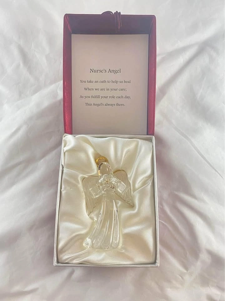 This is a Faithful Guardians Angel with Nurse Hat - Nurse’s Angel Glass Figurine #183618. It’s in excellent condition and comes with the original box.