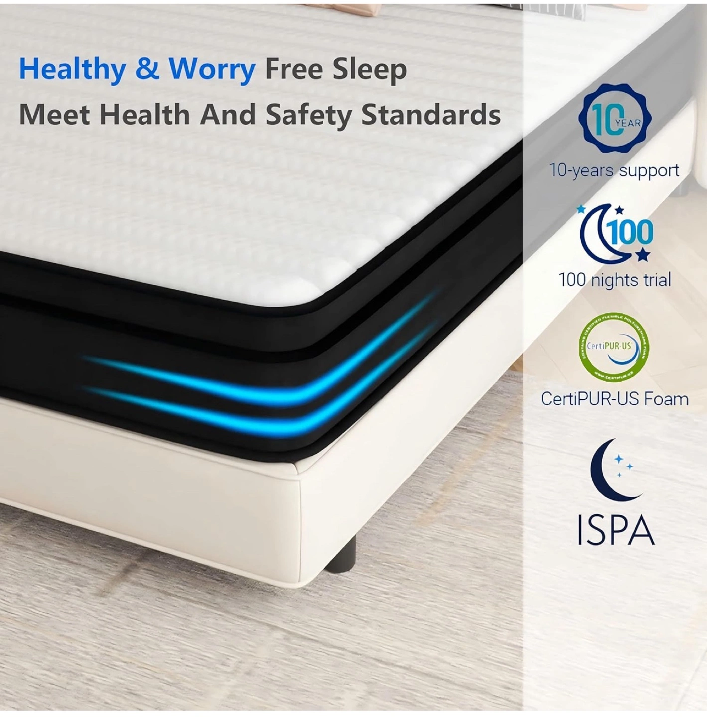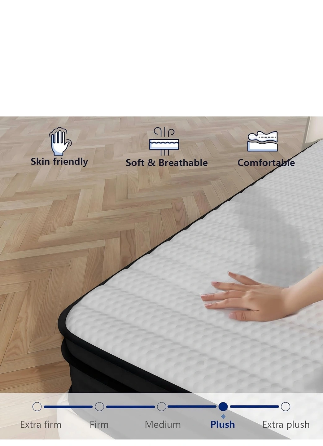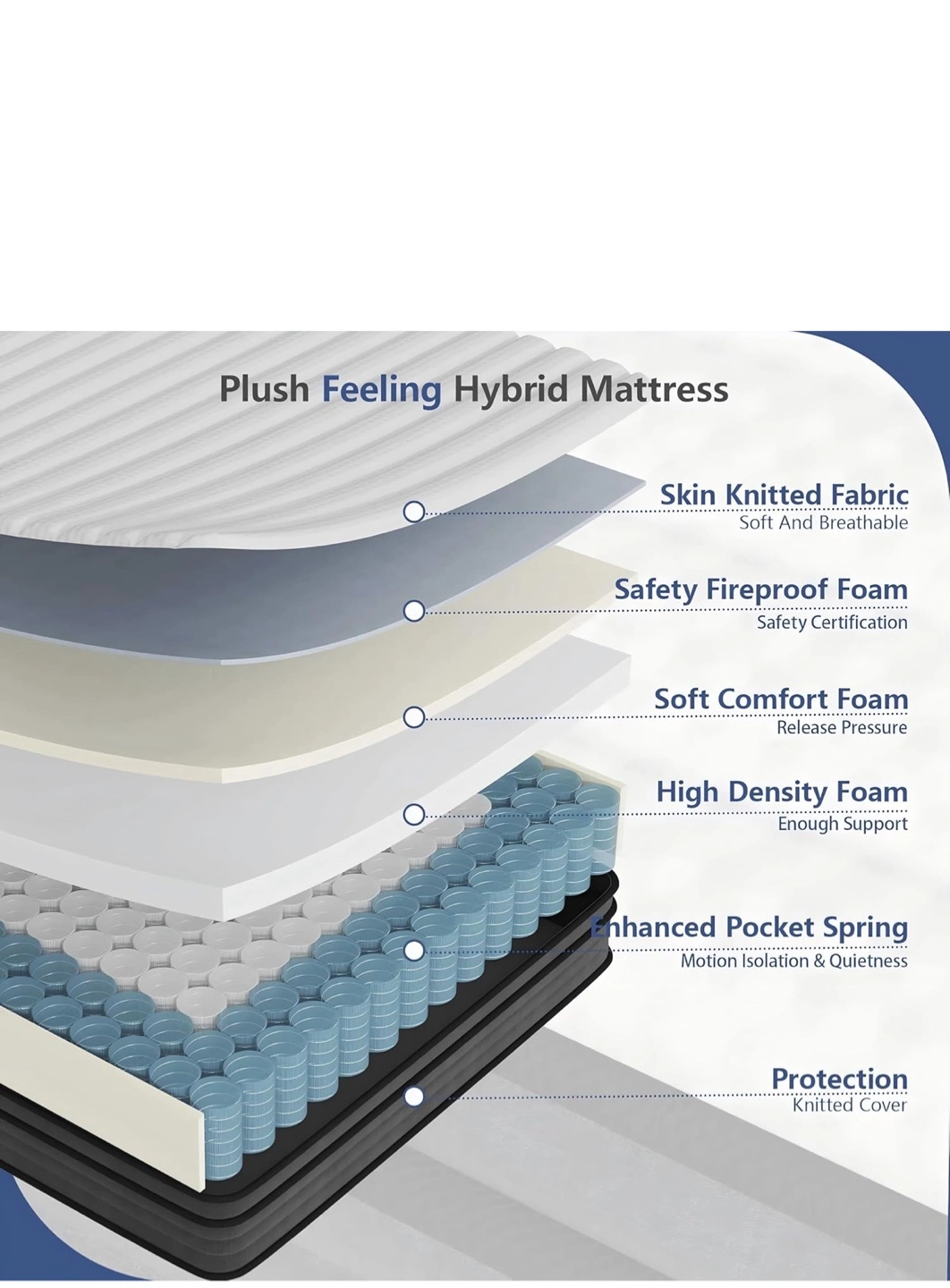 10Looking to upgrade your sleep? This Crayan Plush Feeling Hybrid Mattress is super comfy and in great shape! It features: - Skin knitted fabric that's soft and breathable - Safety fireproof foam for peace of mind - Soft comfort foam to release pressure - High-density foam for support - Enhanced pocket spring for motion isolation and quietness