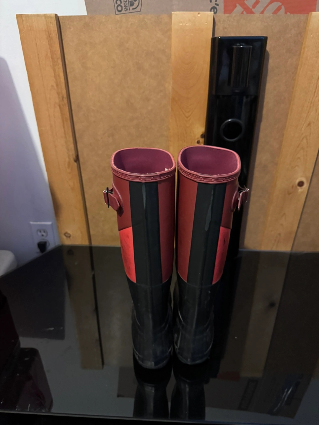 Selling a pair of Hunter rain boots. They are black with red accents. Great for rainy days!