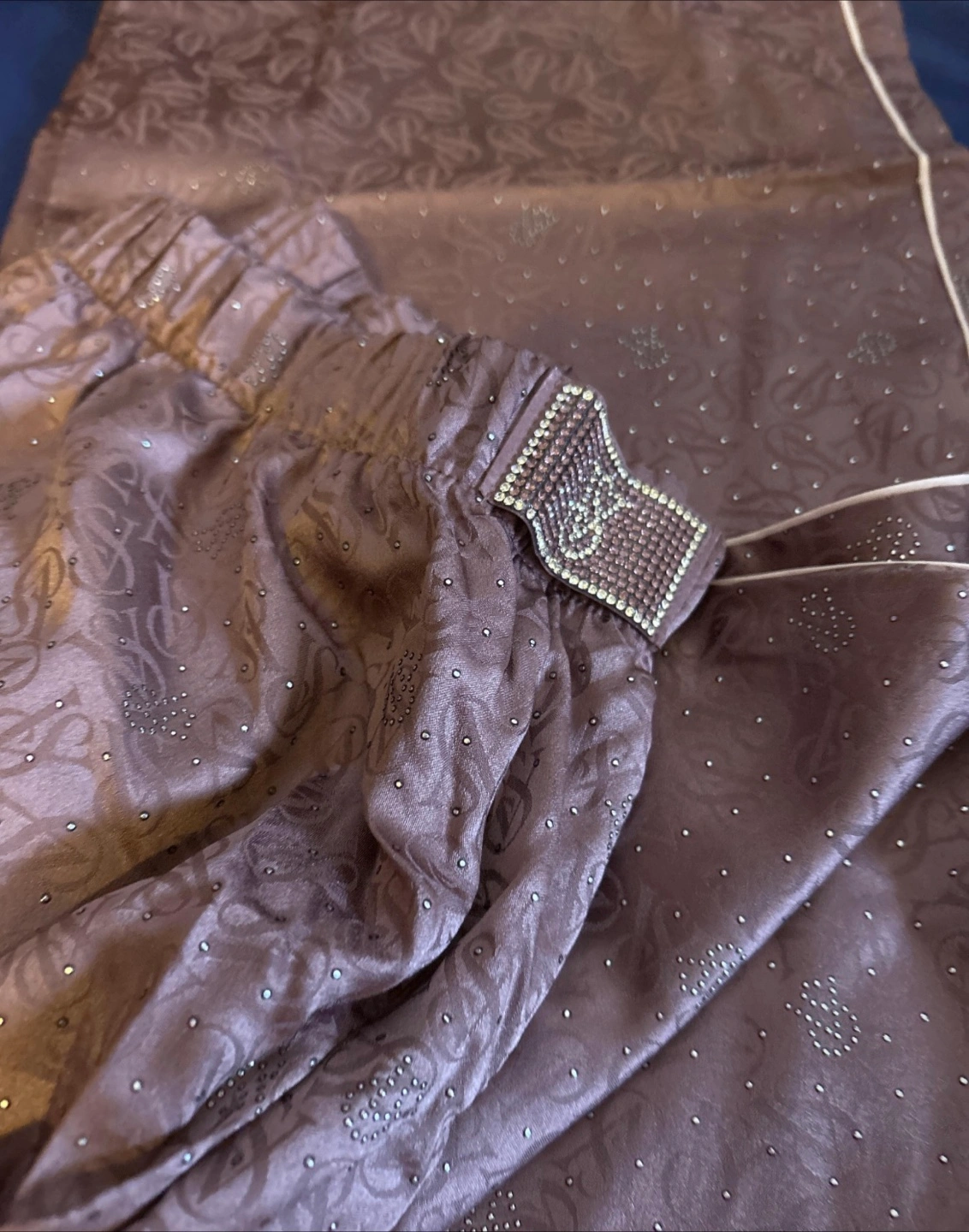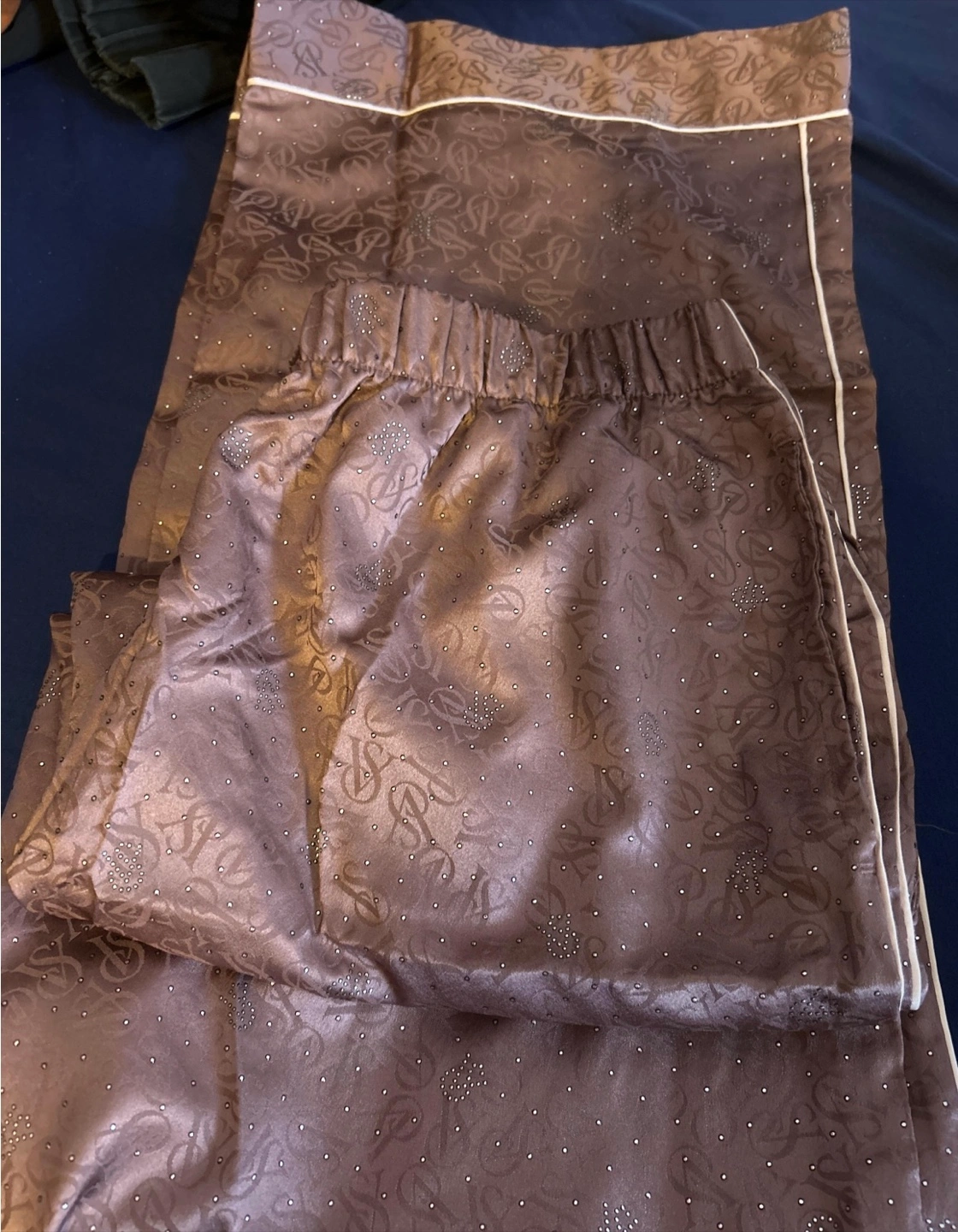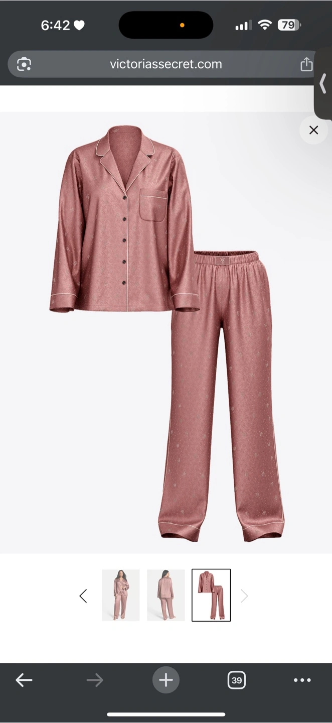 Victoria's Secret pajama set in a beautiful mauve colour. The set includes a long-sleeved button-up top and pants. The material feels soft and luxurious to the touch. Perfect for a cozy night in!