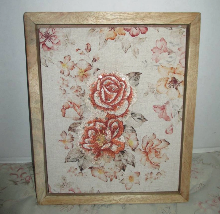 Beautiful floral wall art with a wooden frame. The artwork features a lovely floral design with roses and a few sequins to boot. It measures approximately 13 inches by 10 inches. It's in great condition and ready to add a touch of elegance to any room. pickup in Astoria Queens
