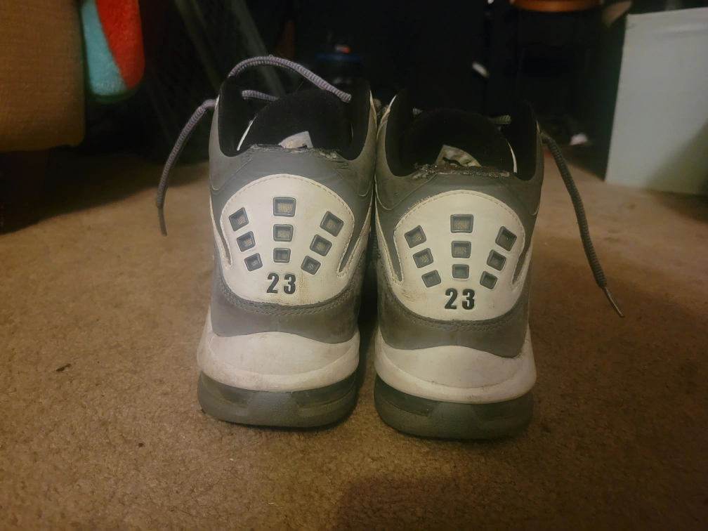 Selling a pair of Jordan Flight 23 sneakers in grey and white. They show some signs of wear but still have lots of life left! The shoes feature the number 23 on the back. kinda beat up but still wearable. (size 9)