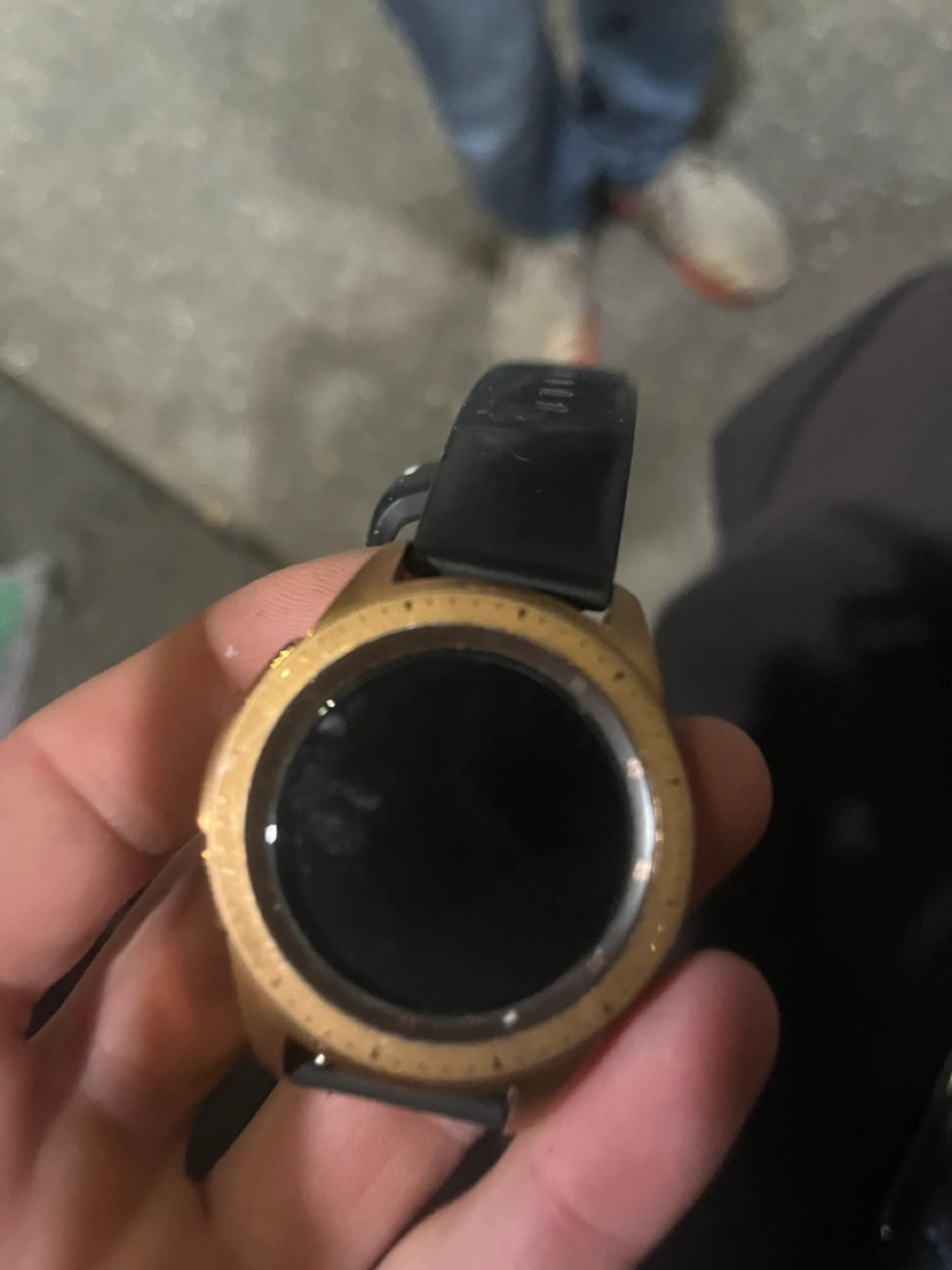 Selling a smartwatch with a gold-coloured bezel and a black band. It shows some signs of use.