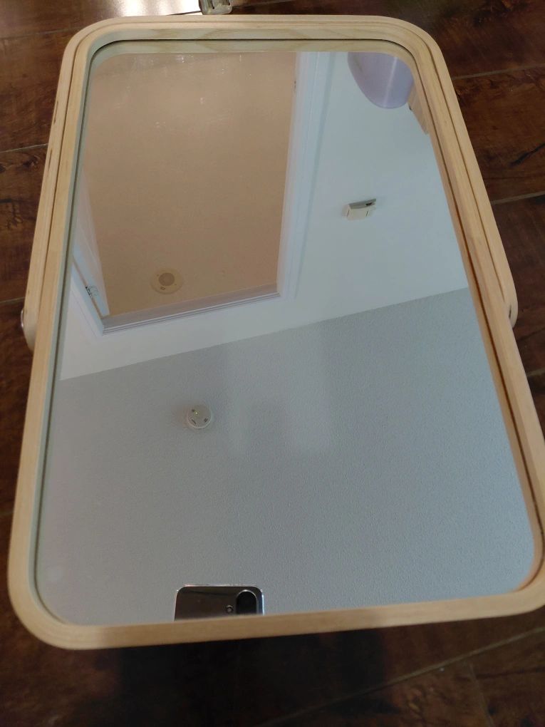 Ikea mirror with kick-stand. Suitable for top of a dressing table or chest of drawers. has hooks in the back of you prefer to hang it. Very cute, light pine. Nice big surface. Yonge & Empress at noon.