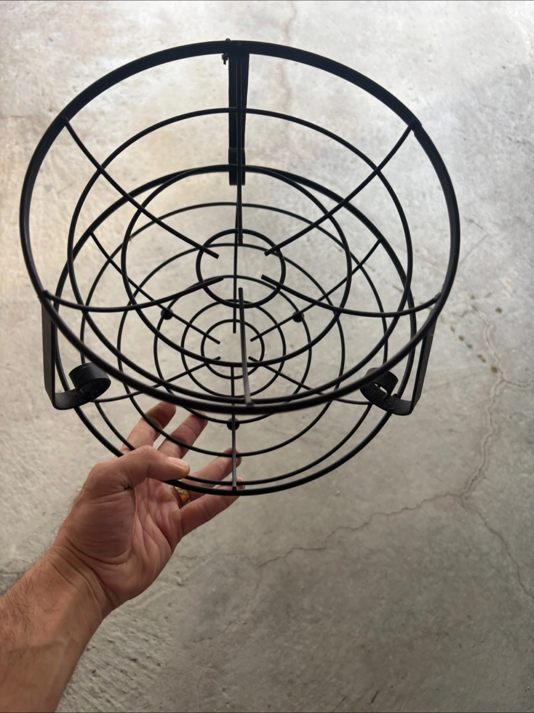 Here's a handy black metal two-tier basket, perfect for storing fruit or other items! It's in great shape and ready to add a bit of functional style to your kitchen or pantry
