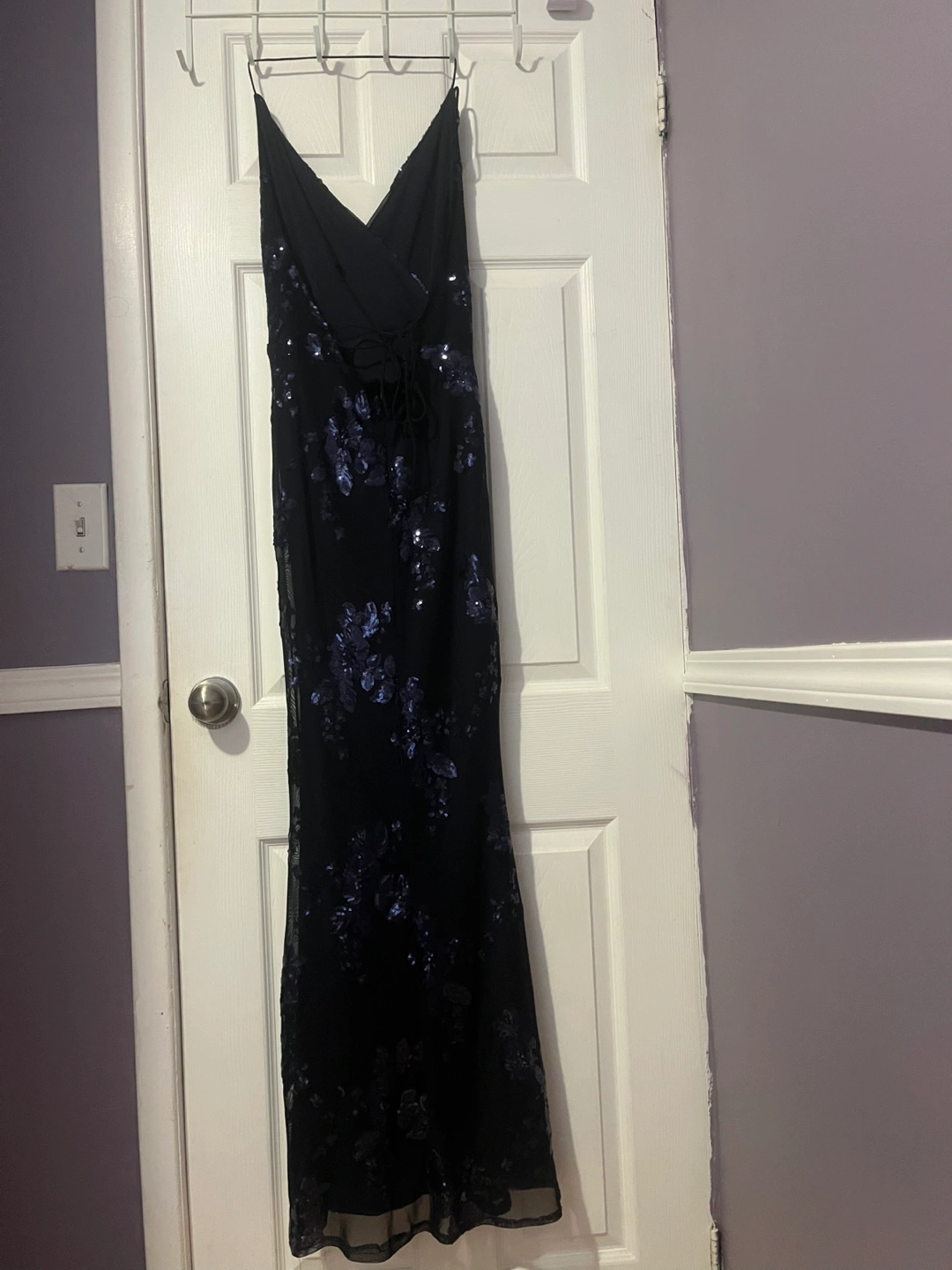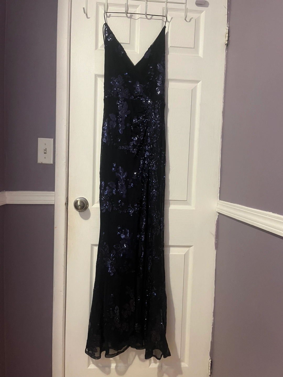 Selling a beautiful navy formal dress with sequin detailing! It's perfect for a special occasion. The dress features a v-neck and a flattering silhouette. It's in great condition and ready for a new home