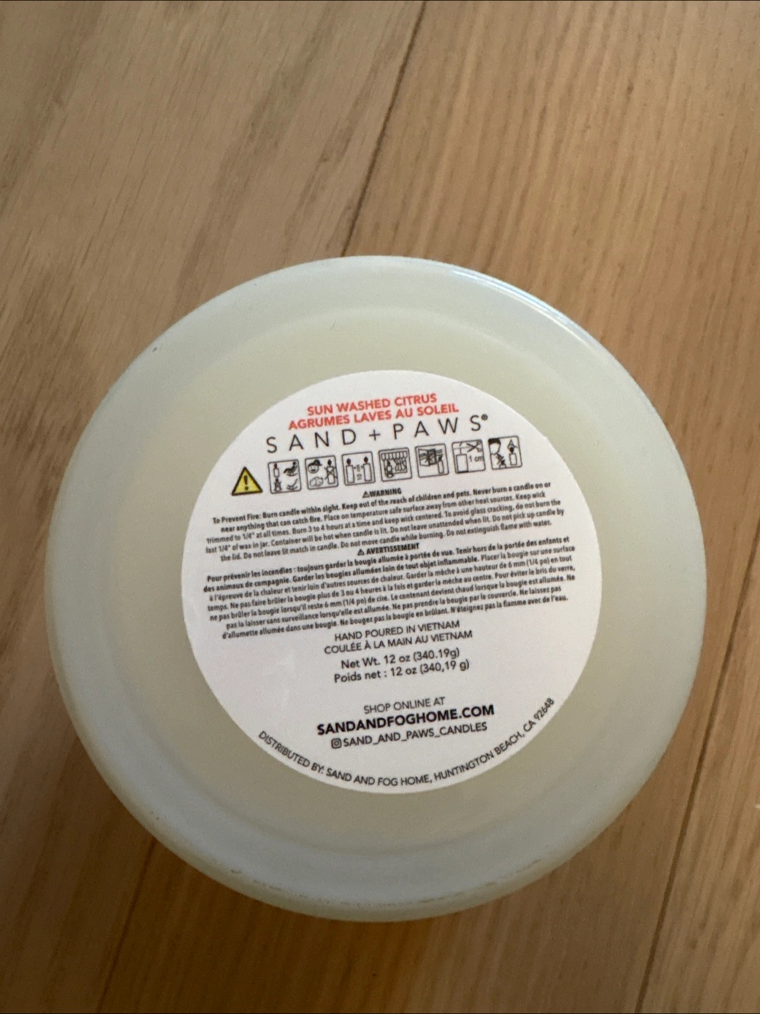 Selling a Sand + Paws candle! It's the Sun Washed Citrus scent and it's designed to neutralize pet odors. Perfect for any pet owner!