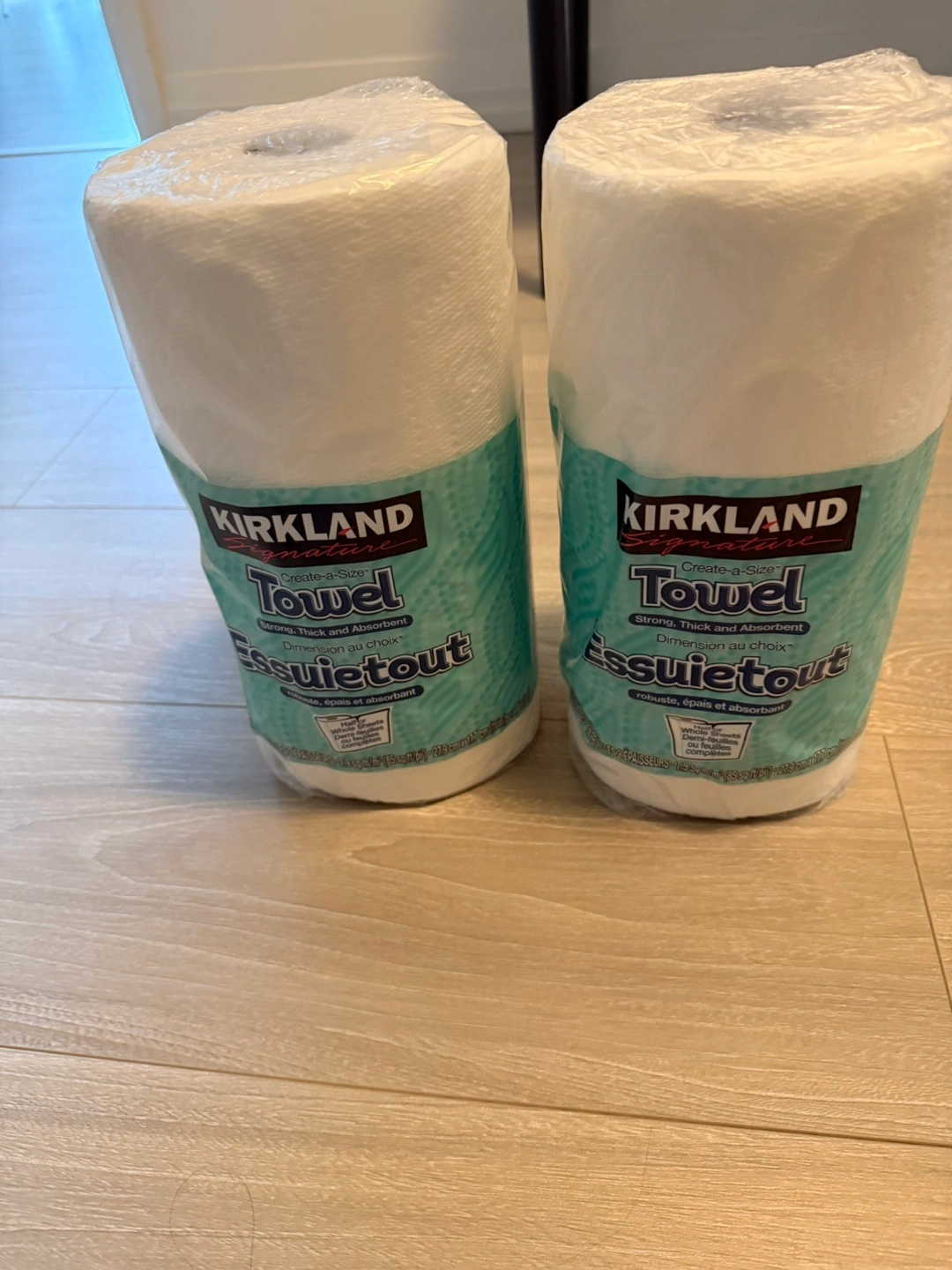 Selling two rolls of Kirkland Signature Create-a-Size paper towels. They're strong, thick and absorbent, perfect for any spills! These are the 'Essuietout' variety, meaning they're robust and absorbent. Each sheet is dimension au choix
