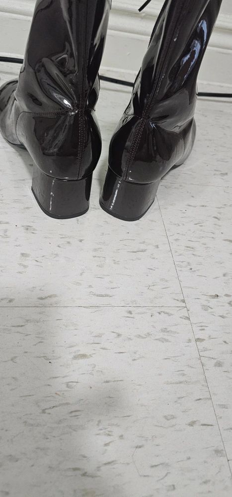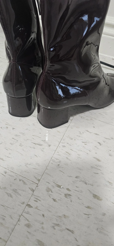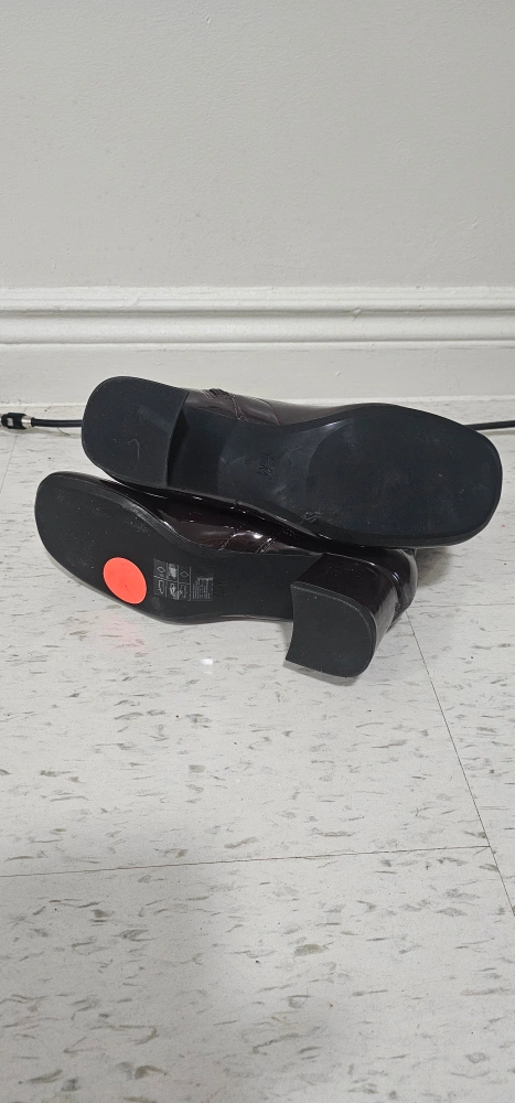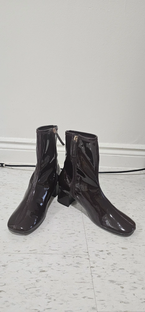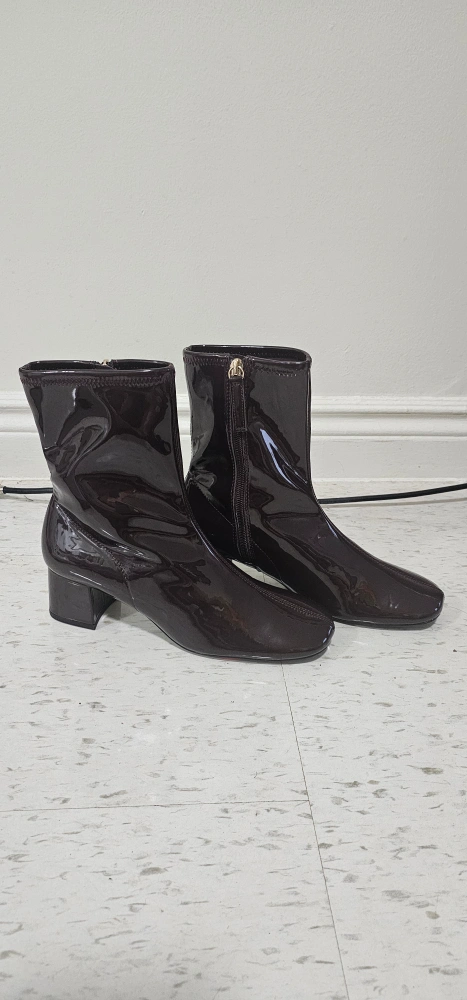 New brand a pair of stylish patent leather ankle boots. Almost mixed burgunday and brown. They feature a zipper closure and a block heel. and ready for a new home!