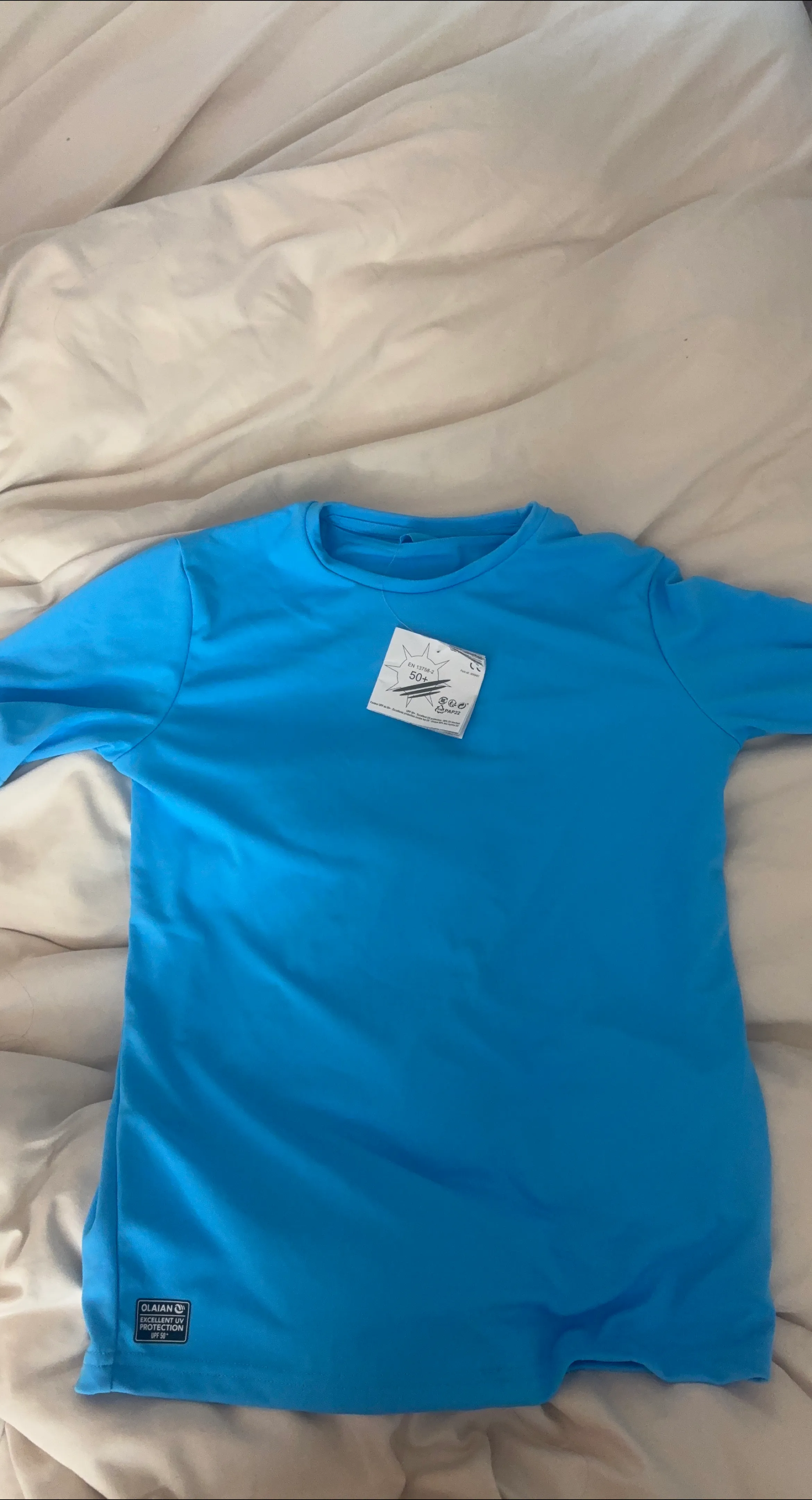 Selling a Decathlon Olaian water t-shirt in blue. It's size 14 years and has excellent UV protection (UPF 50+). Great for swimming or any outdoor water activities!