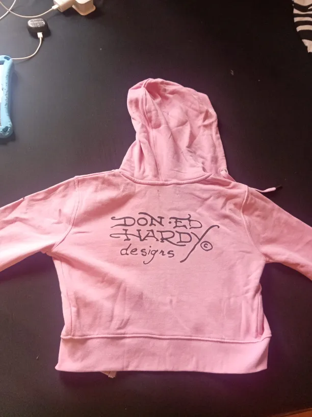 Selling a cute Ed Hardy pink hoodie! It has a unique design on the front and the brand name on the back. Perfect for adding a bit of flair to your wardrobe!