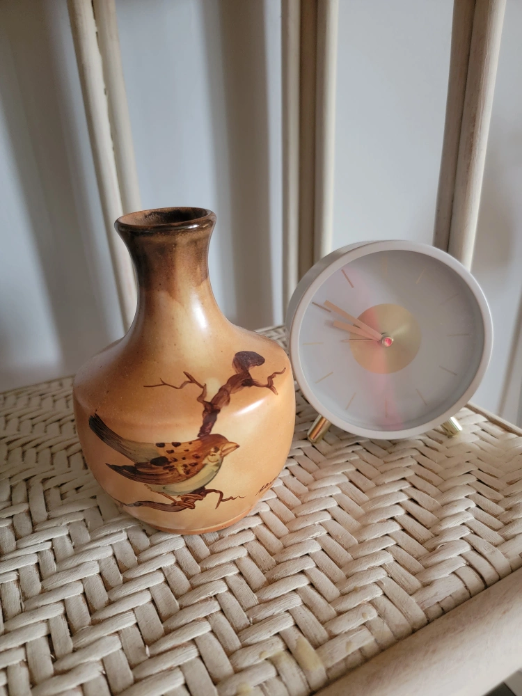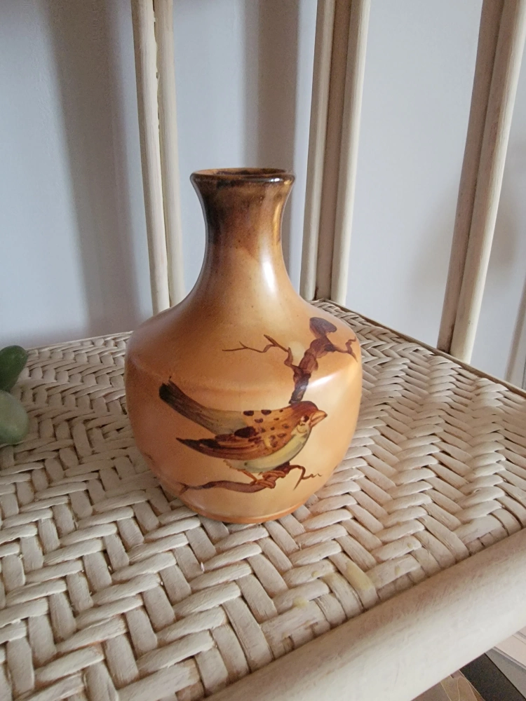 Selling a vintage vase with a lovely bird design. It's in great condition and would look lovely on any shelf or table. The vase has a unique shape and colour, adding a touch of vintage charm to your home