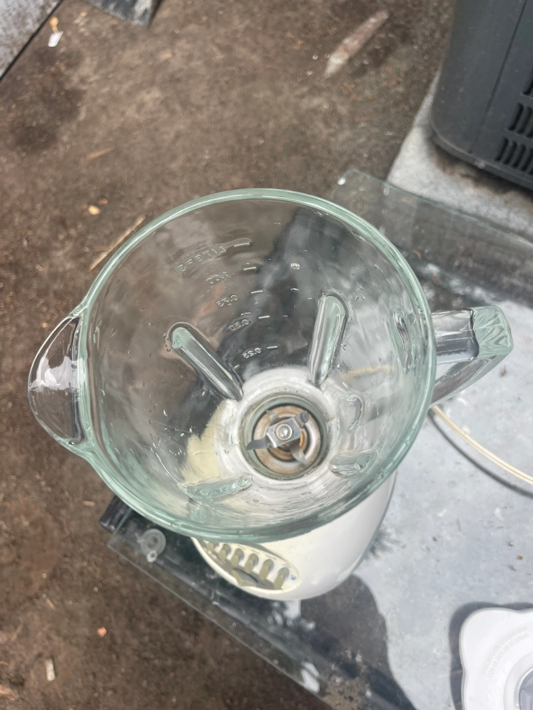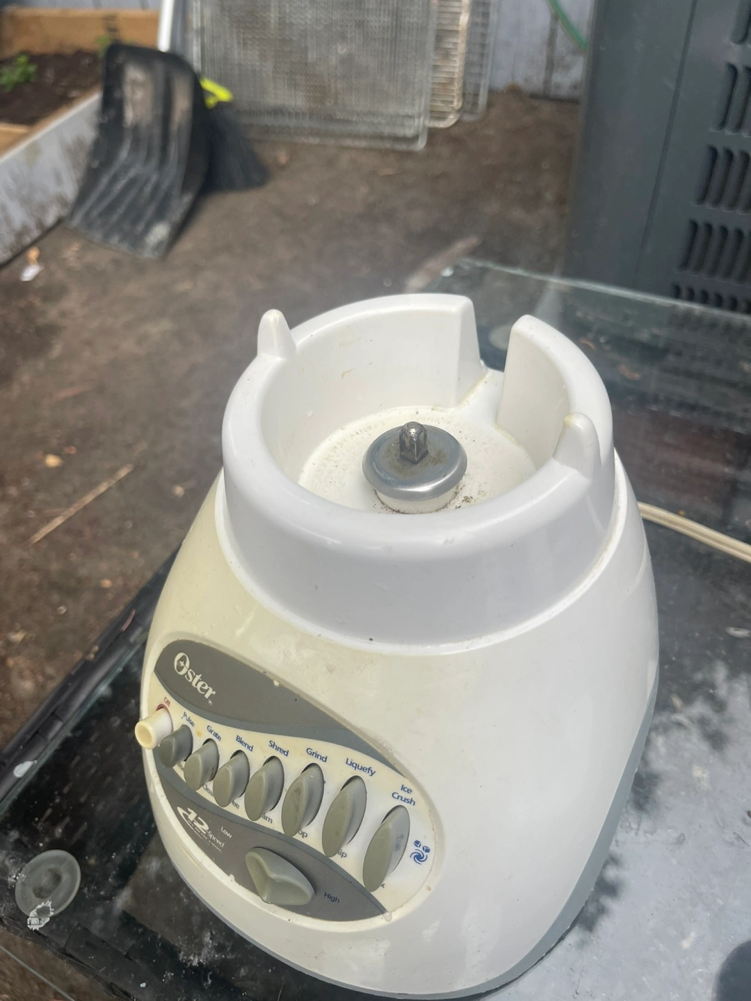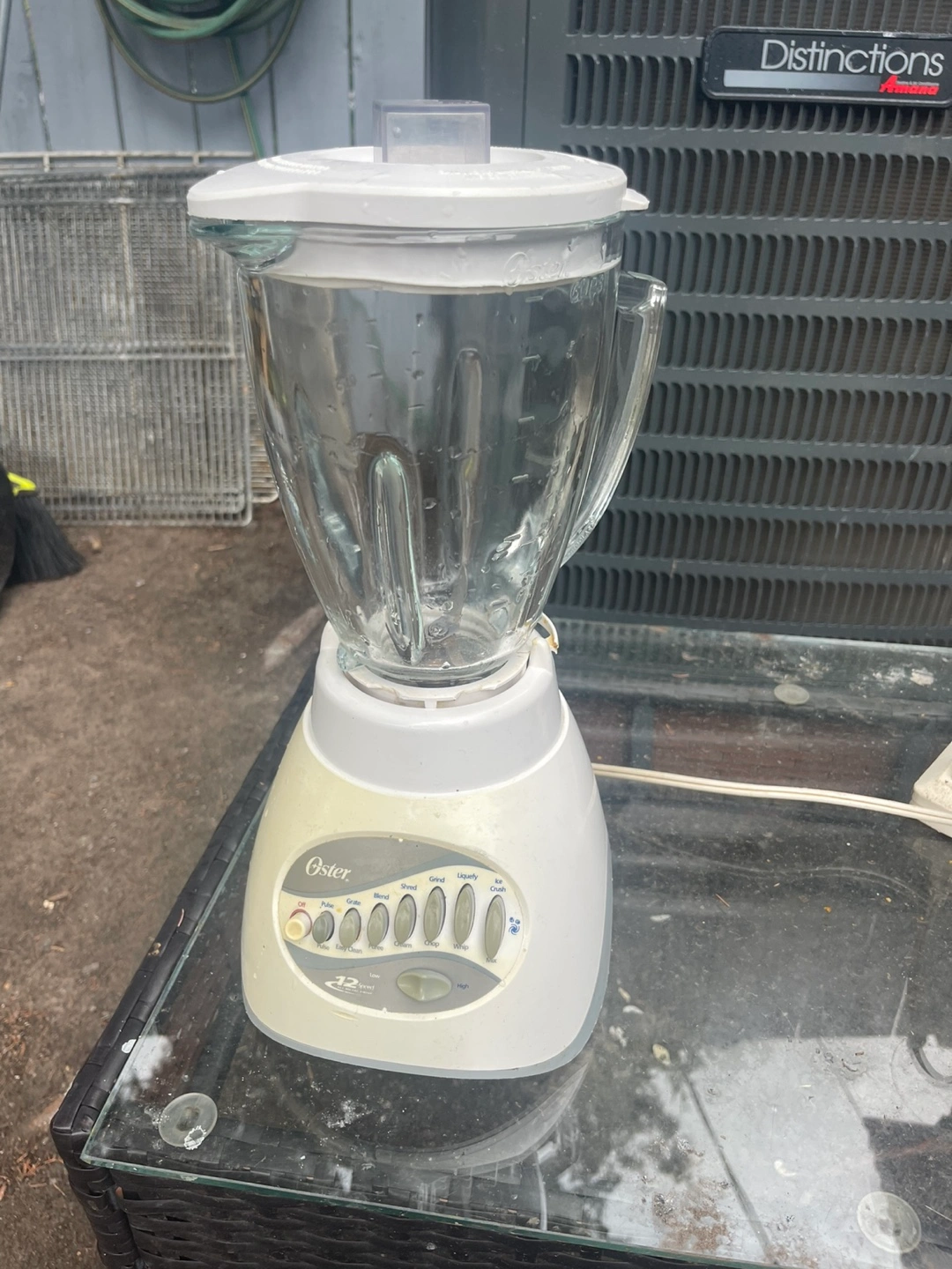 Selling a used Oster blender. It has multiple speed settings for blending, pureeing, and ice crushing. The jar is made of glass and has measurement markings on the side. It shows signs of use.