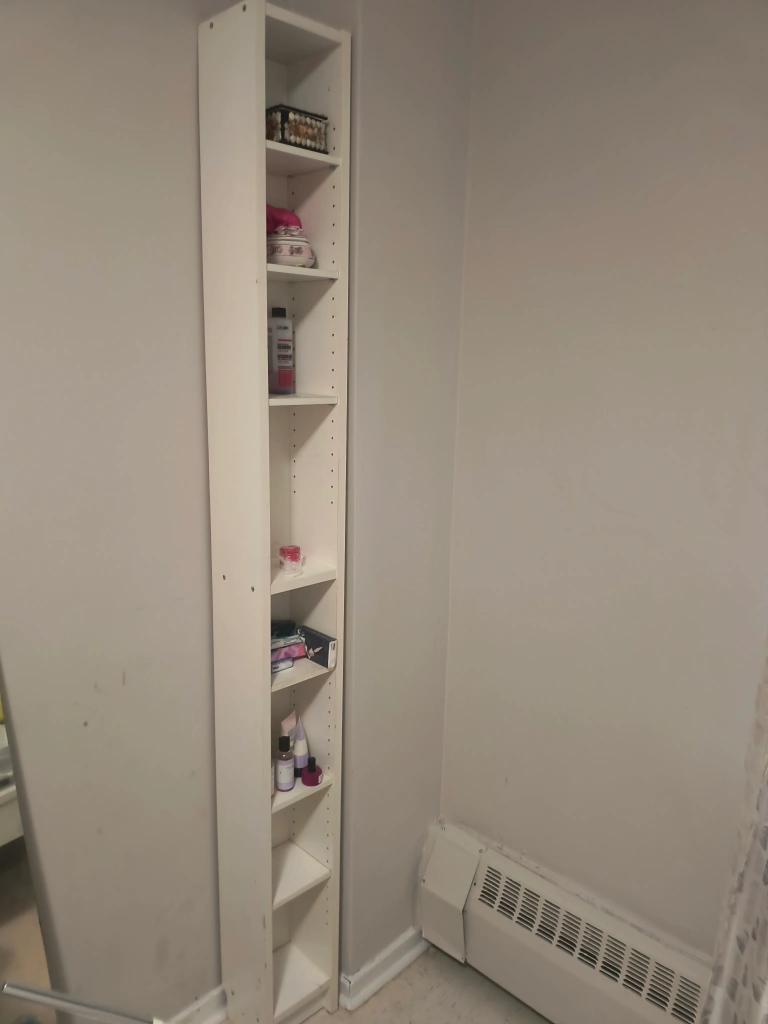 Selling a tall, narrow white shelf. Perfect for a bathroom or any small space where you need some extra storage. It's in good shape and ready to use