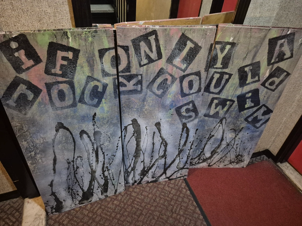 This is a triptych art panel set with an abstract design. It features a gray background with black abstract shapes and stenciled lettering. The 3 separate wood panels are in good condition and ready to add a unique touch to your space. Has hooks to hang up. It spells out" If only a rock could swim" 44" h, 22" w Cash