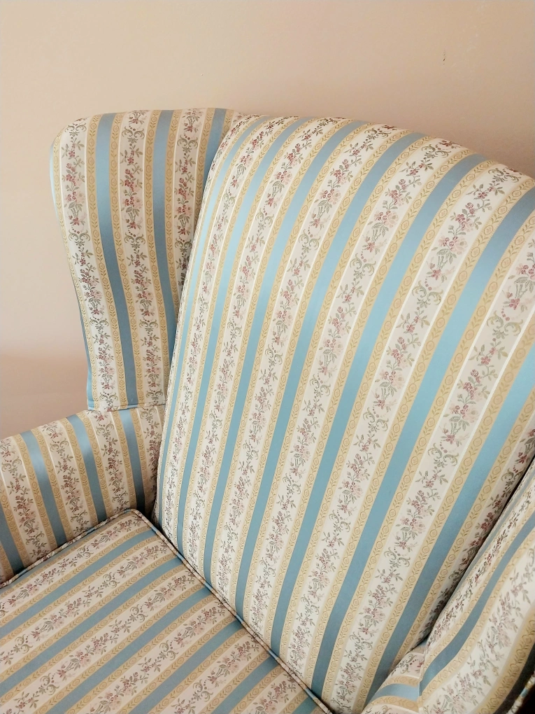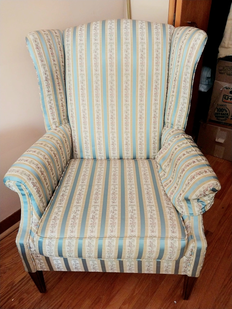 Cozy up with this charming wingback armchair! It features a delightful floral and stripe pattern in soft blues, creams, and pinks. Perfect for adding a touch of vintage elegance to any room, this chair is both stylish and comfortable. It's in great condition and ready for a new home!