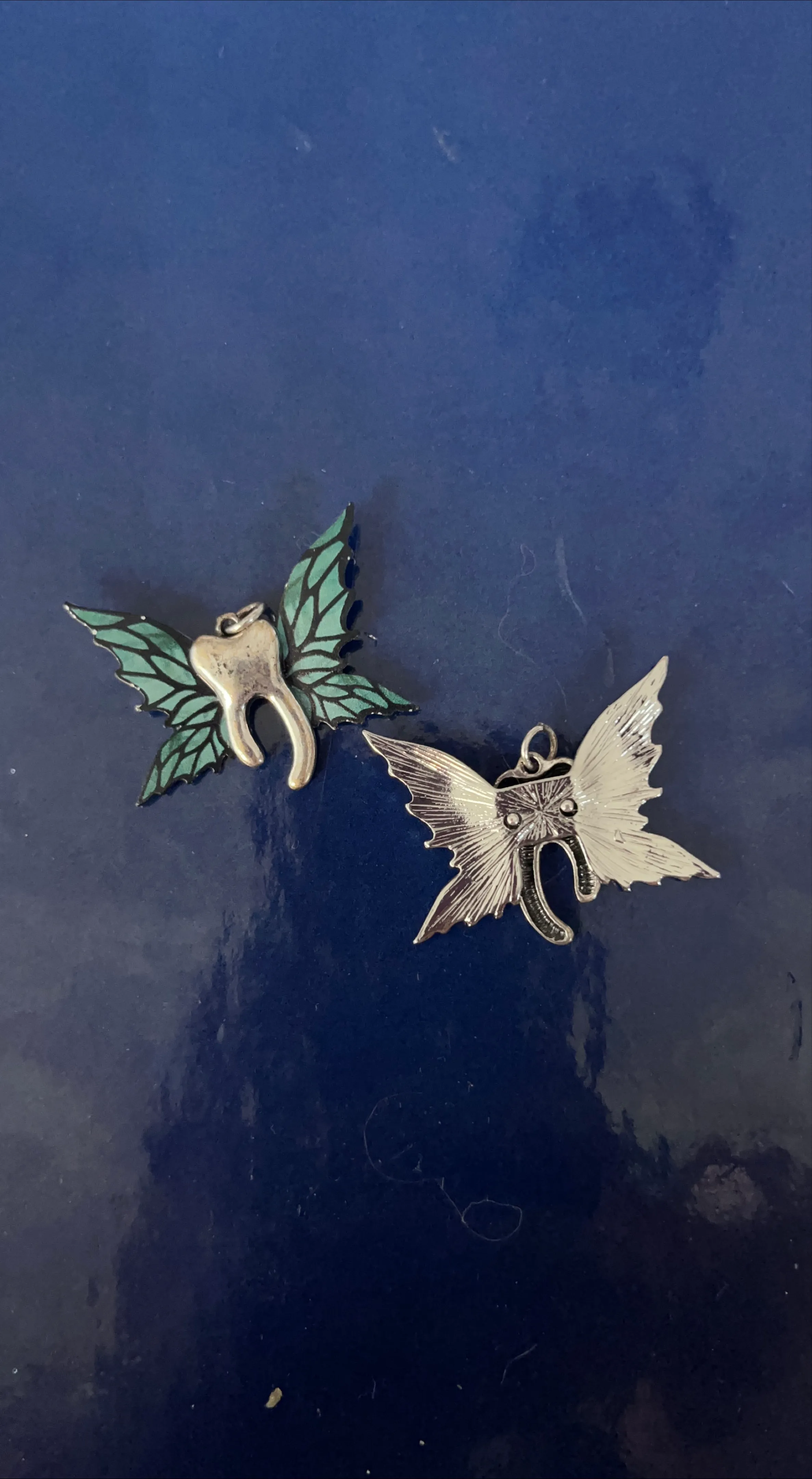 A unique pendant for sale! It is a silver tooth with green fairy wings. Perfect for anyone in the dental field or a fun gift for a child!