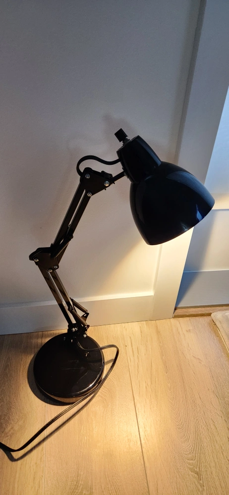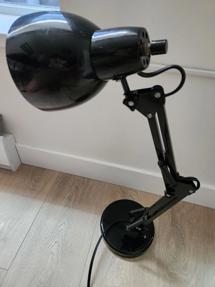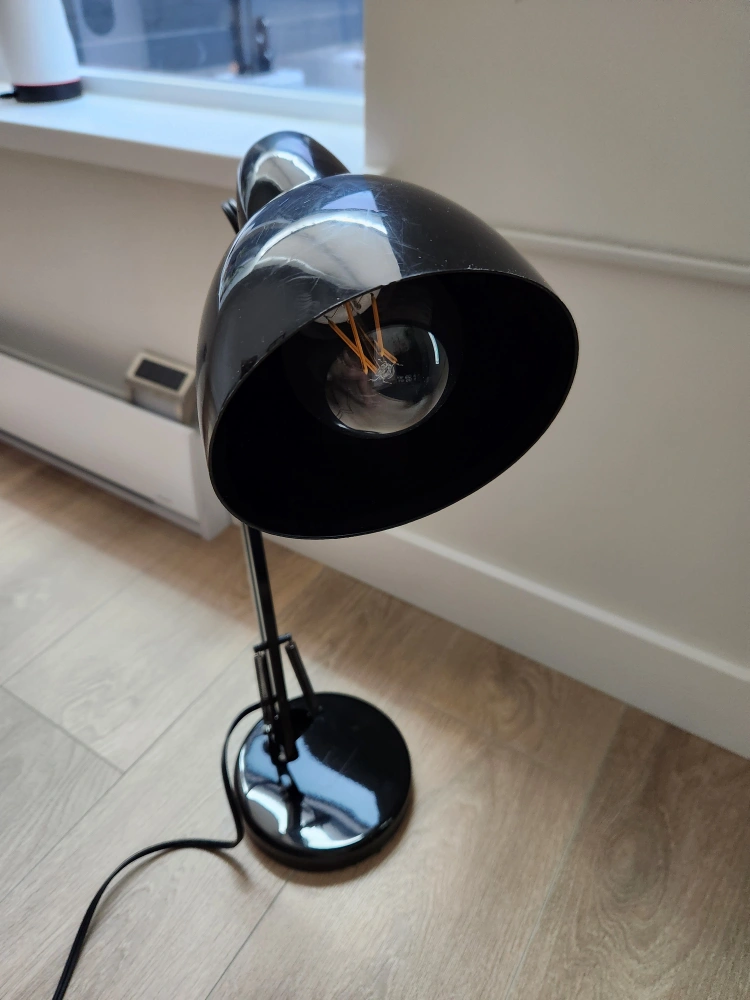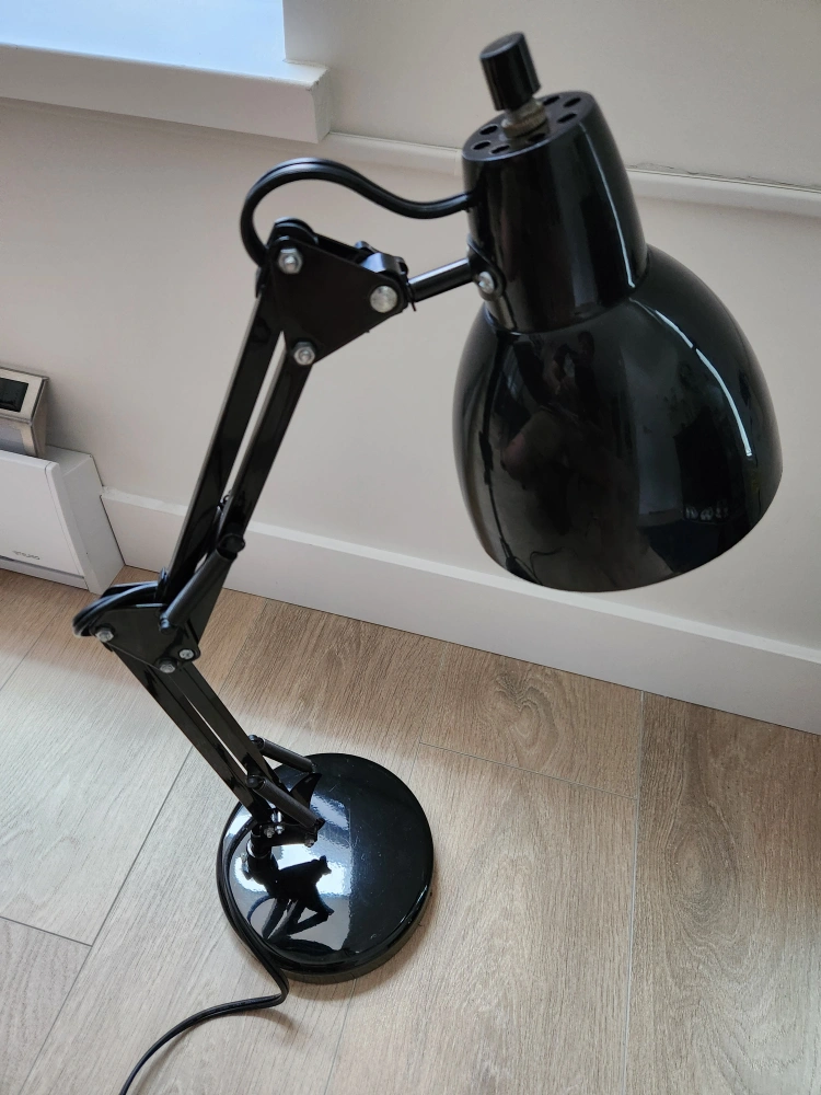 Selling a black adjustable desk lamp. It's in great condition and perfect for a home office or study space. The adjustable arm makes it easy to direct the light where you need it. It's a simple and functional design that will fit into any decor.