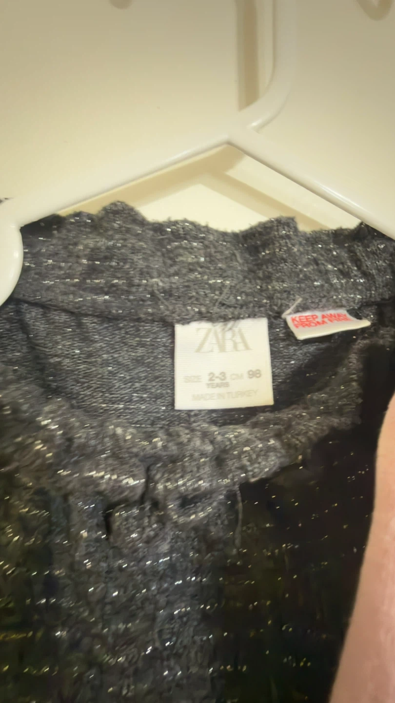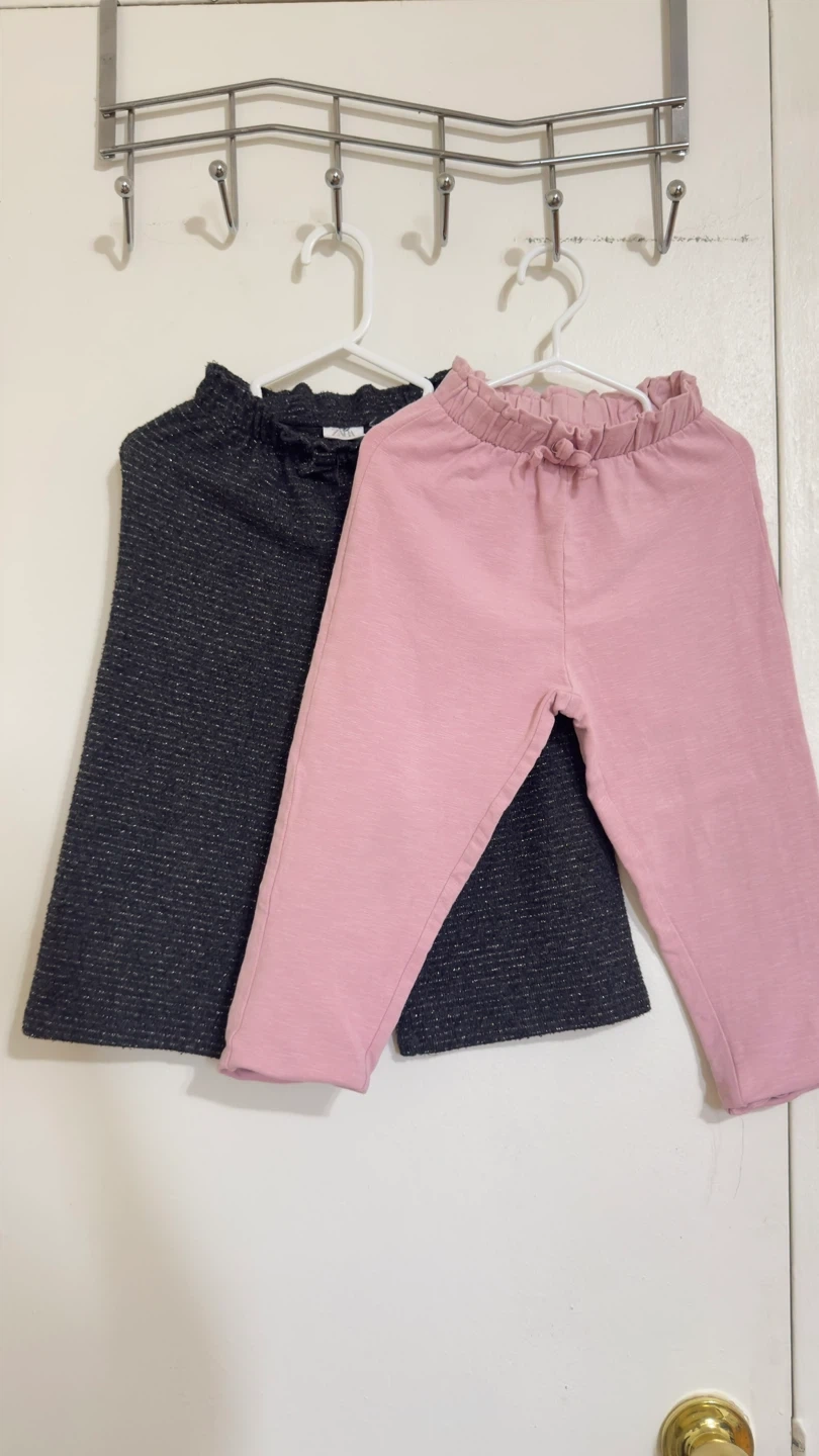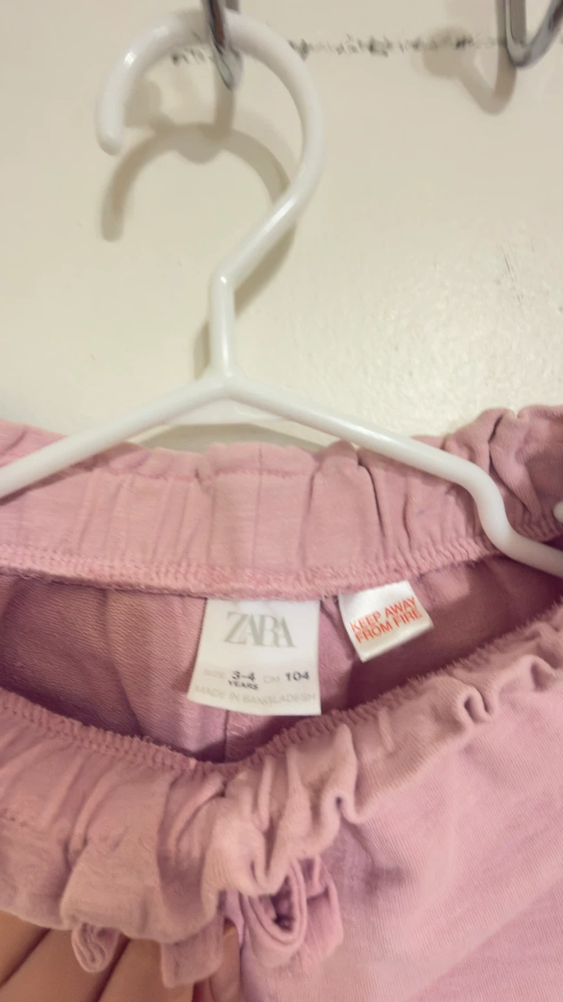 Two pairs of Zara kids pants. One pair is black with glitter detail, size 2-3 years (98 cm). The other pair is pink, size 3-4 years (104 cm). Both made in Turkey/Bangladesh.