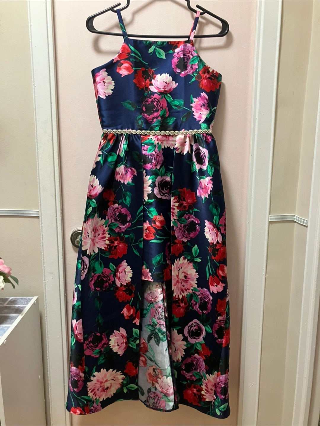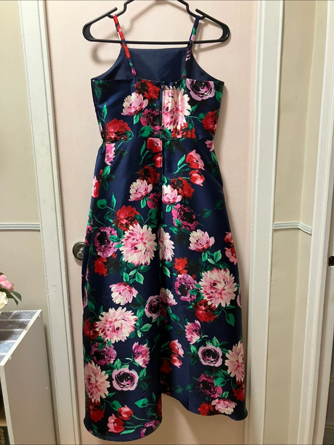 Selling a cute floral print dress with cape skirt! It features a navy blue background with a vibrant floral pattern of pinks and reds. The dress has a high-low hemline and delicate spaghetti straps. Perfect for a special occasion or a fun night out