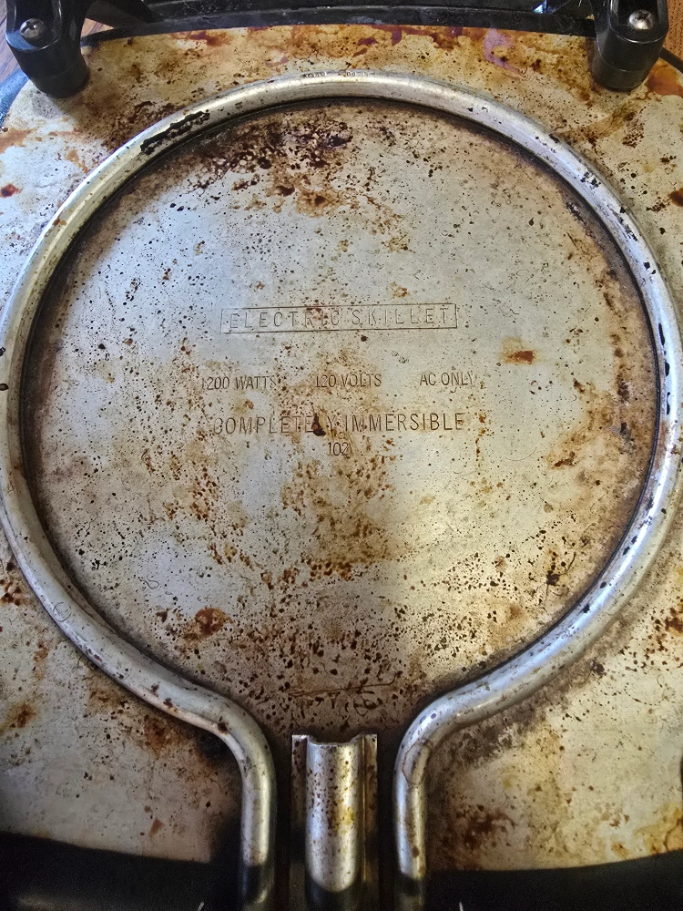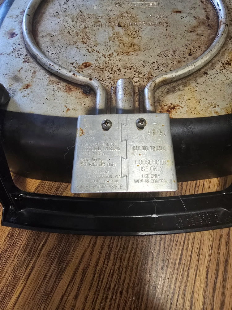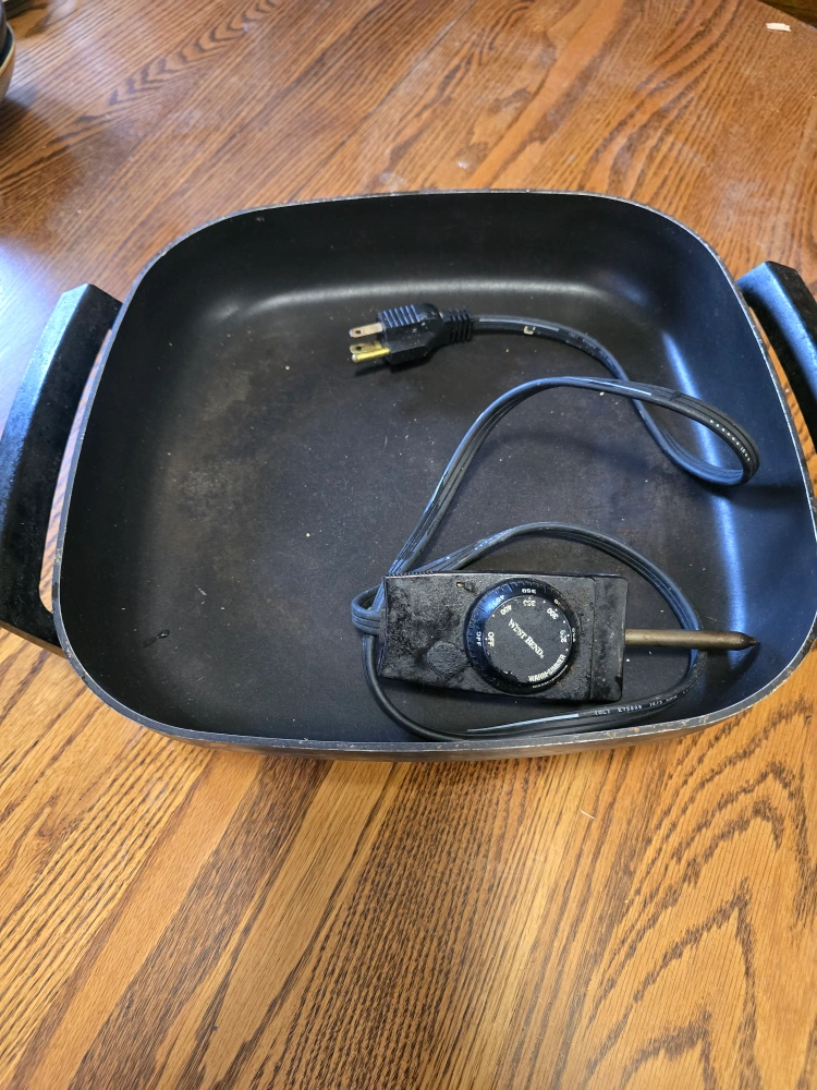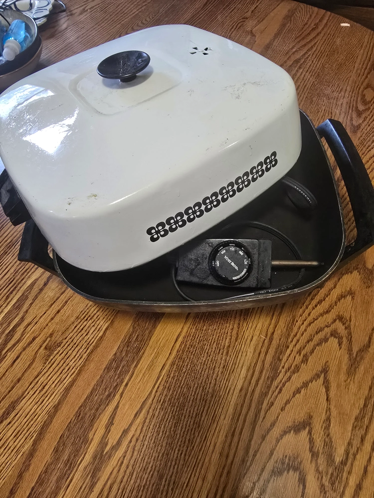 Selling a vintage West Bend electric skillet. It's showing its age with some wear and tear, but it's still functional. It's an electric skillet with a temperature control probe. It's marked as 1200 Watts, 110 Volts, AC only, and completely immersible.