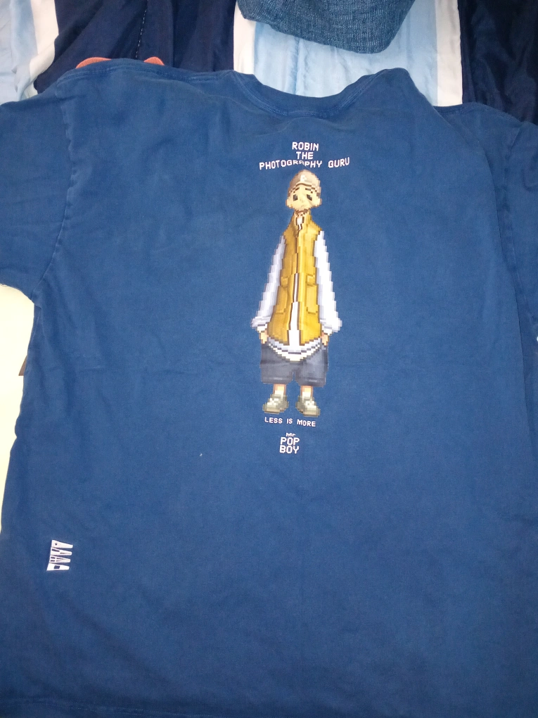 Selling a Mr. Pop Boy t-shirt in blue! The shirt features a graphic of a character with the text "Robin the Photography Guru" and "Less is More". It's a unique piece to add to your wardrobe