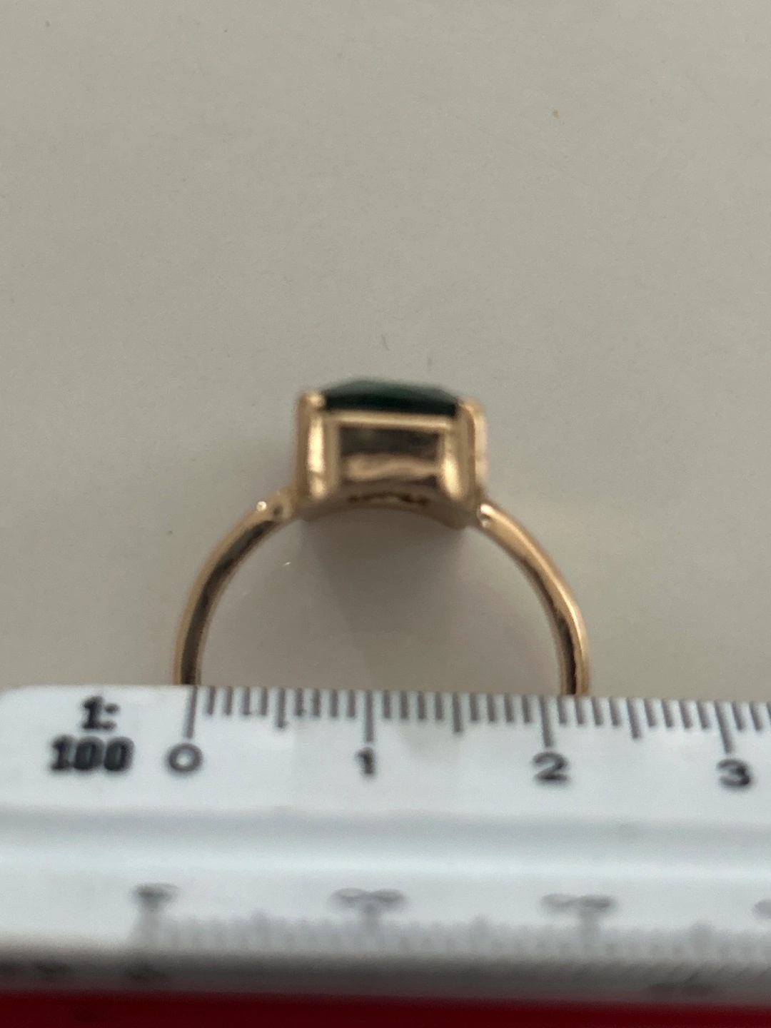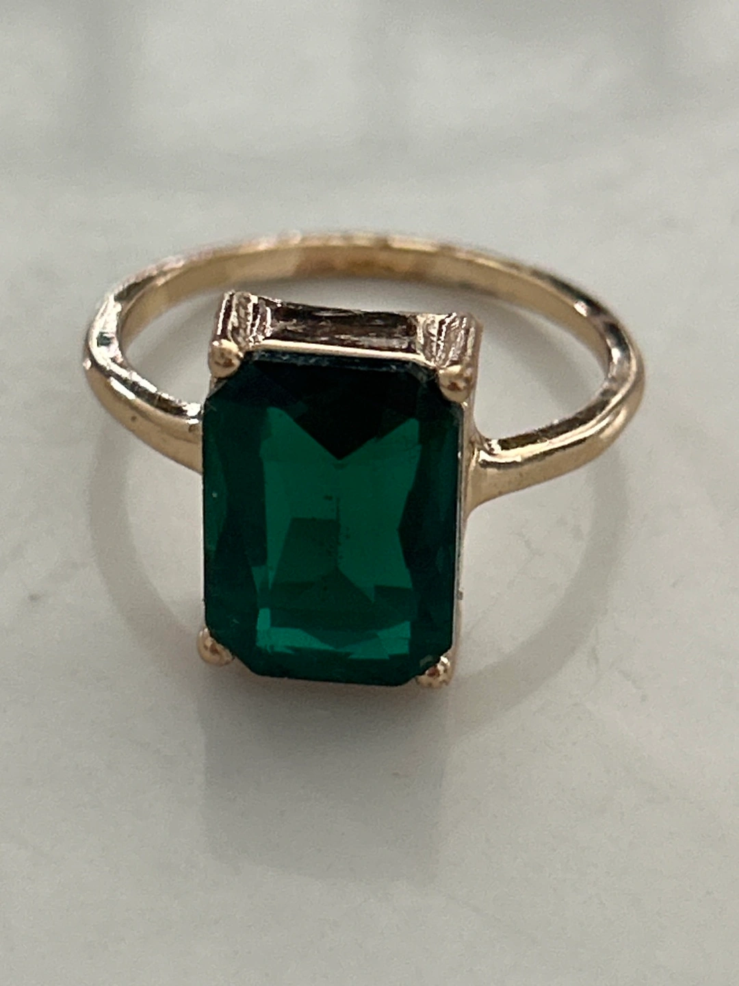 Selling a ring with a green stone! It's in great condition and ready to wear. The band appears to be gold in colour.