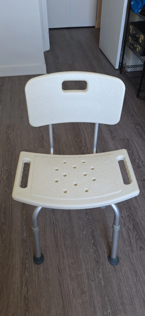 Selling a shower chair with a backrest. It's in good condition and provides a safe and comfortable seating option for anyone who needs assistance while showering. Lightweight and easy to move around