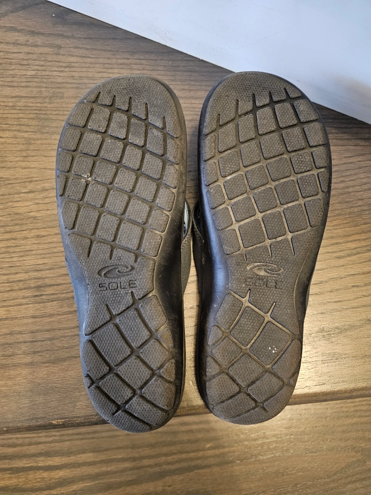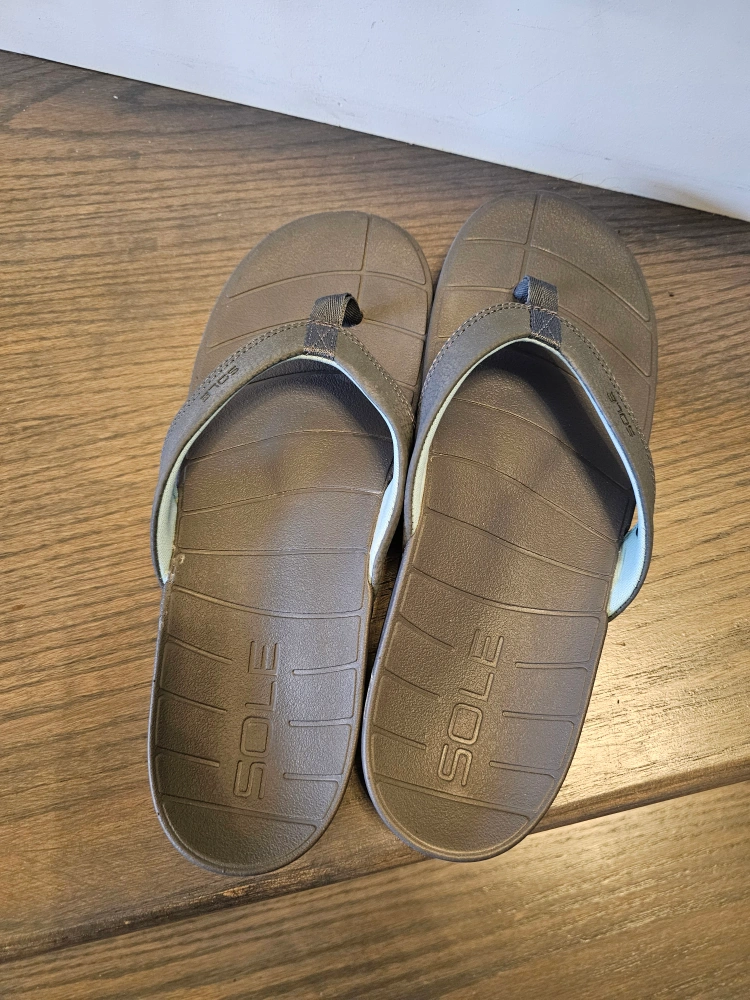 Selling a pair of SOLE women's flip flops. They are in good condition and ready for a new home. The size is Women's 9 (US/CA). Grey with Aqua accents. Cash Only.