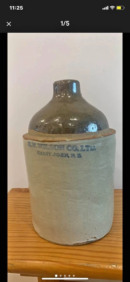 This is an antique stoneware jug by R.W. Wilson Co. LTD Saint John N.B. It's in good condition, showing its age with grace and charm. A true collector's item!
