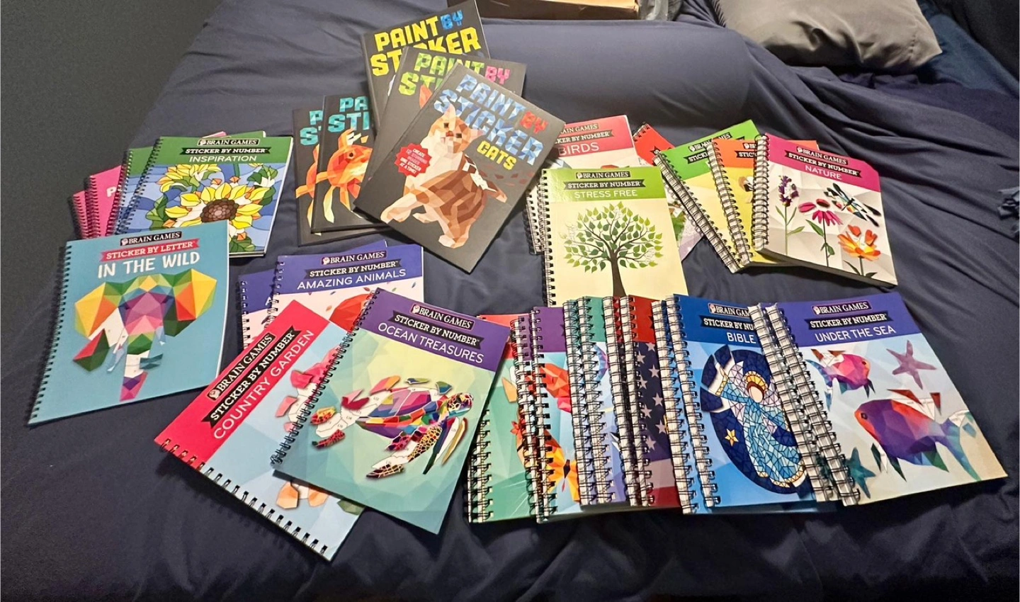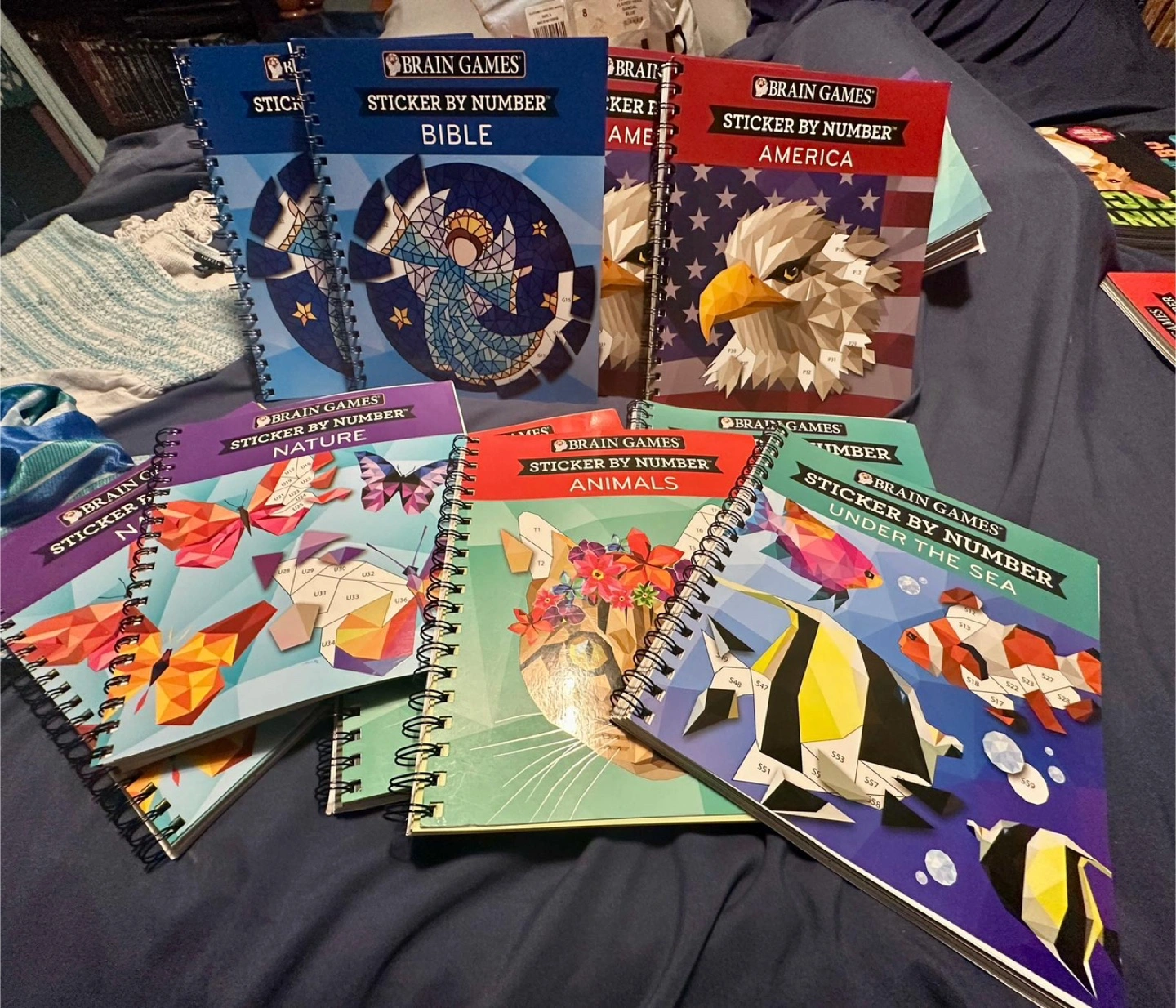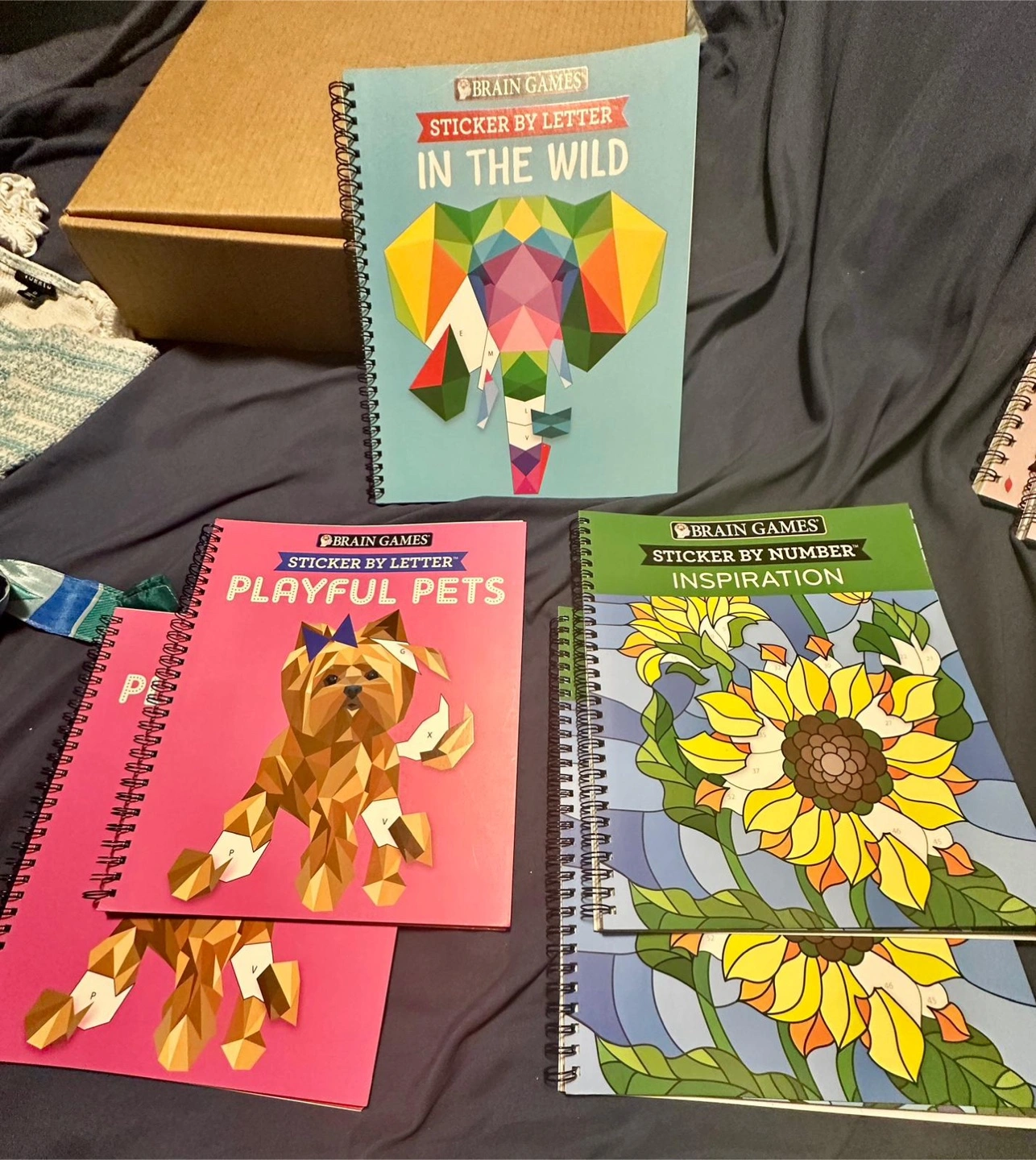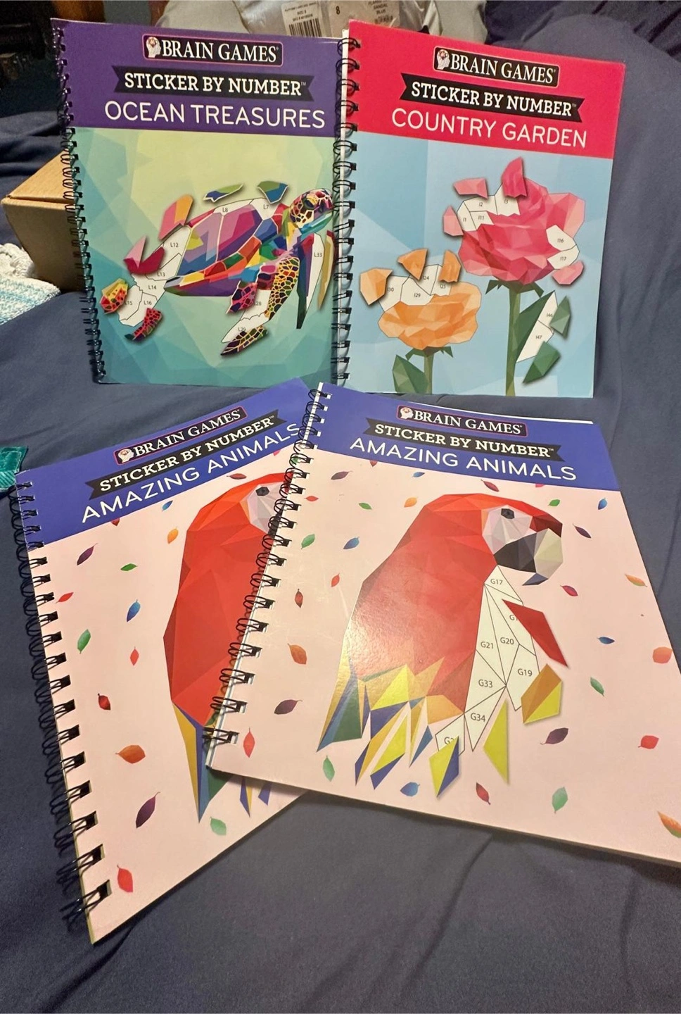 I'm selling a collection of Brain Games sticker by number and sticker by letter books. There are many different themes, including: