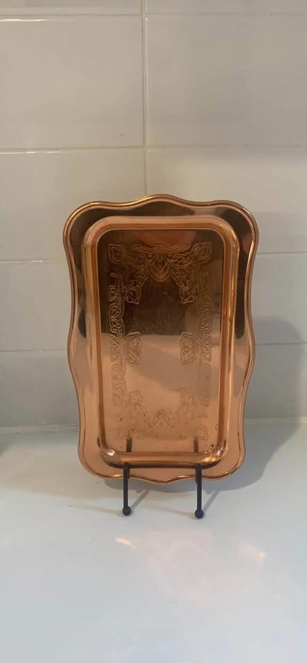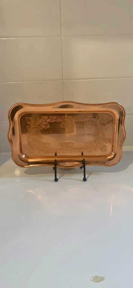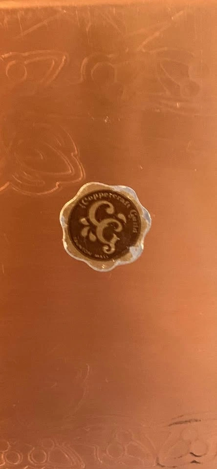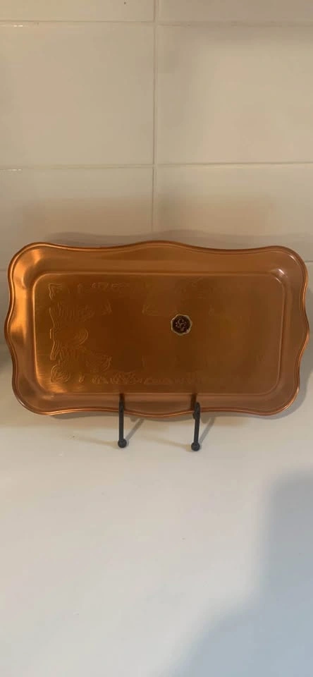 Vintage Coppercraft Guild embossed copper tray. It is made of PURE copper and features an embossed floral design. The tray measures approximately 10 x 6 inches. These trays were popular in the mid-20th century and are now considered vintage collectibles. The age of the tray is approximately 50 years old, dating back to 1975