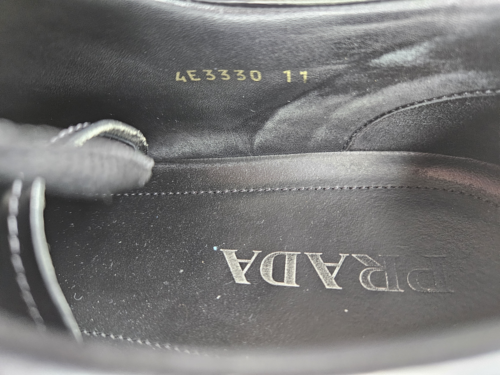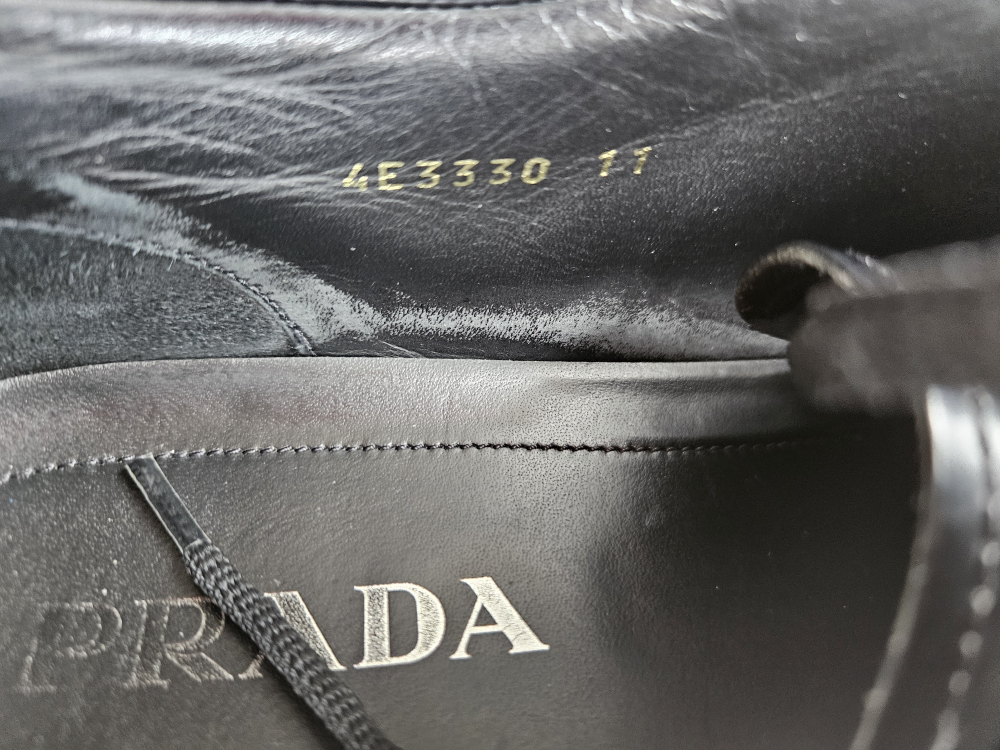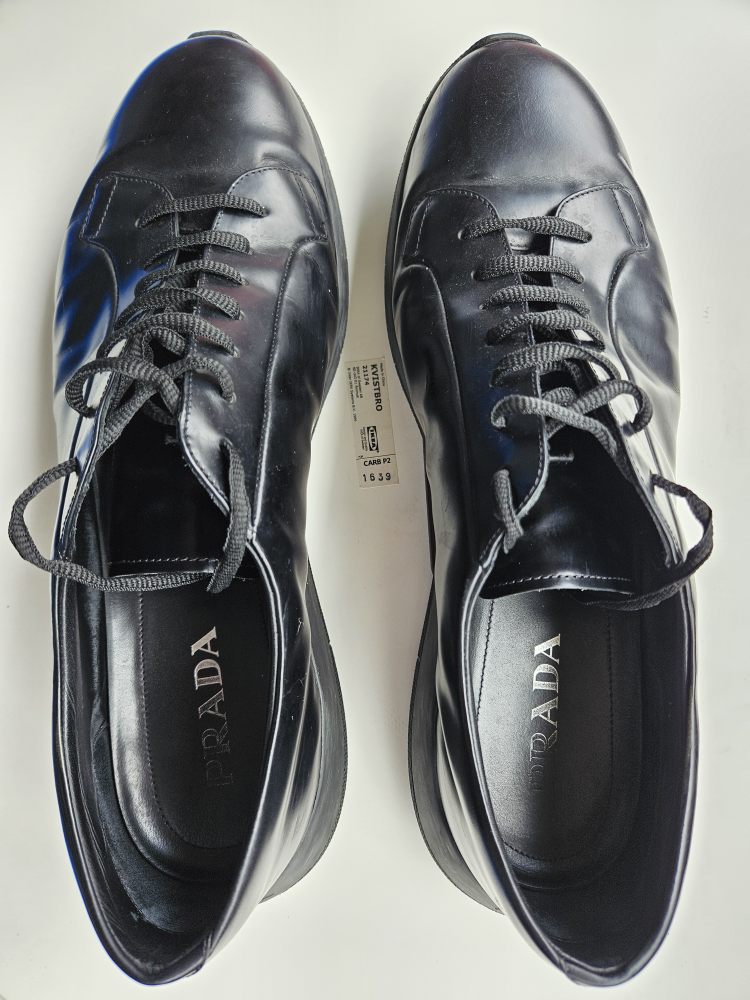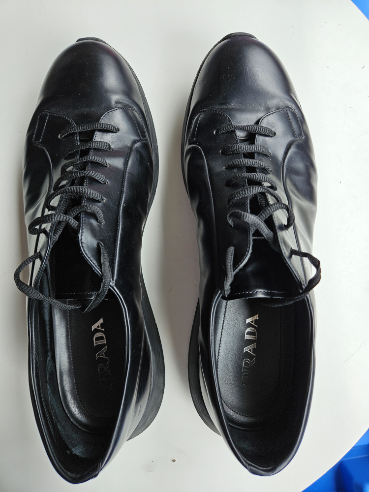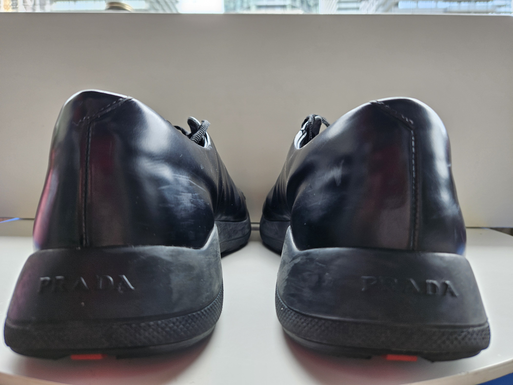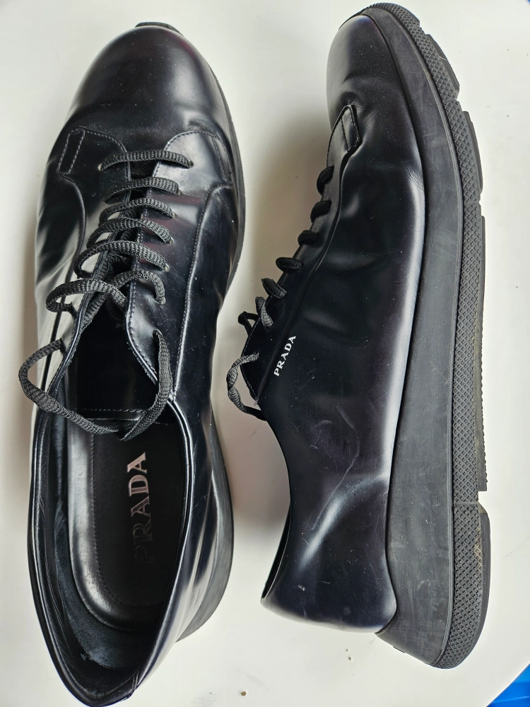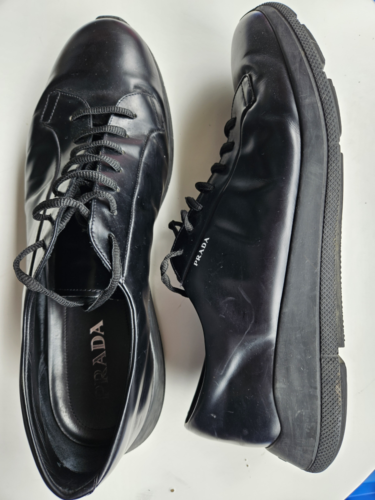 Selling a pair of Prada black leather sneakers. They show some signs of wear but are still in good condition and have lots of life left!
