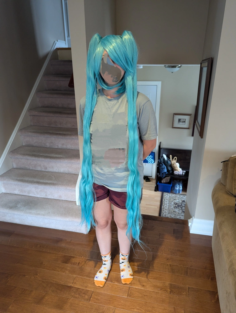 Selling a Hatsune Miku cosplay wig! It's turquoise in colour and has long pigtails. Perfect for cosplay or just for fun