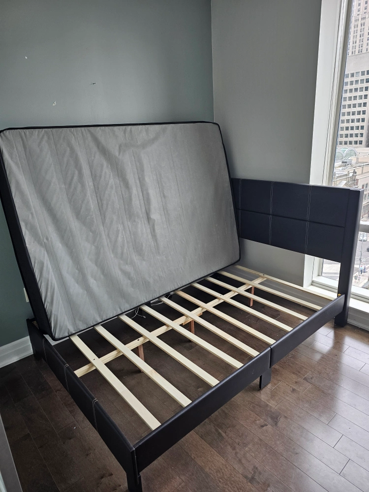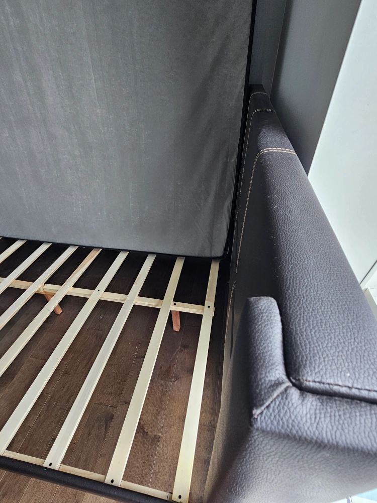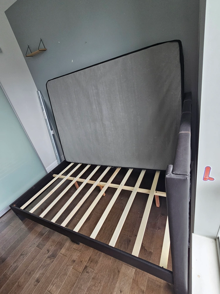 Selling a full size/double bed frame with a mattress. The bed frame is black simili leather.