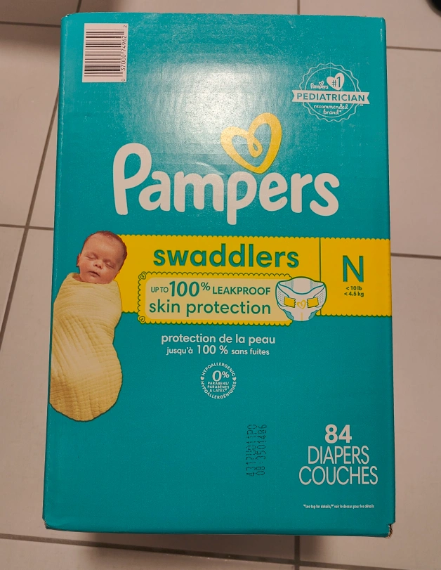 Selling a new box of Pampers Swaddlers diapers! They are size N (Newborn) which fits babies under 10 lbs or 4.5 kg. The box contains 84 diapers. These offer up to 100% leakproof skin protection and are hypoallergenic with 0% parabens and latex.