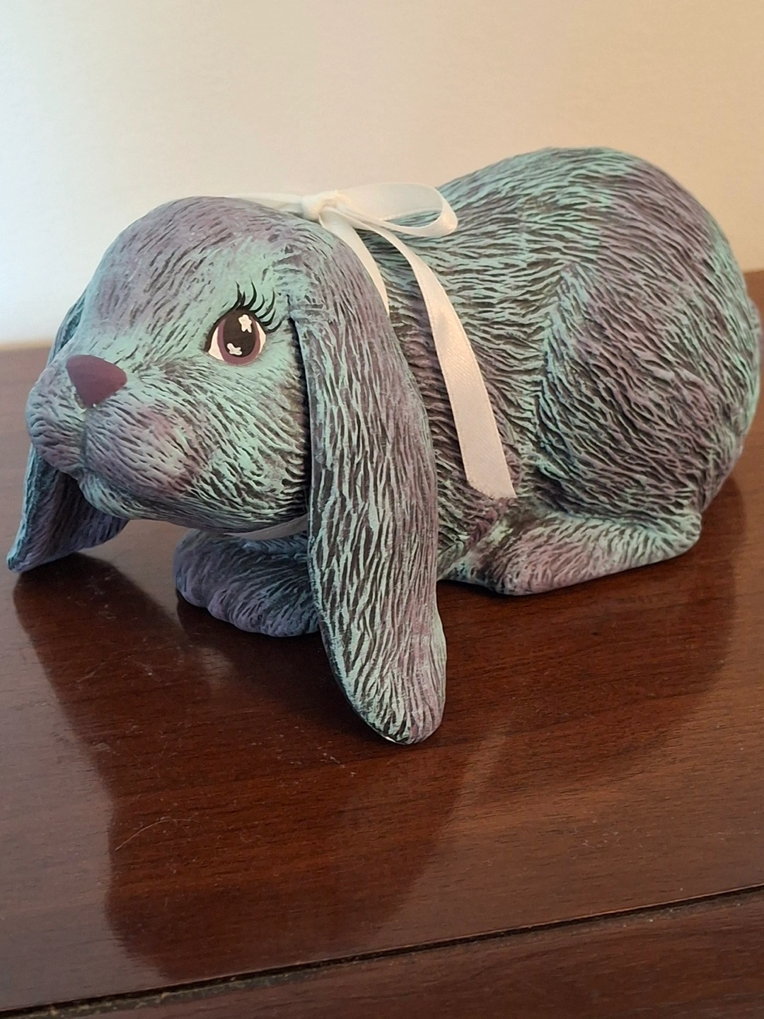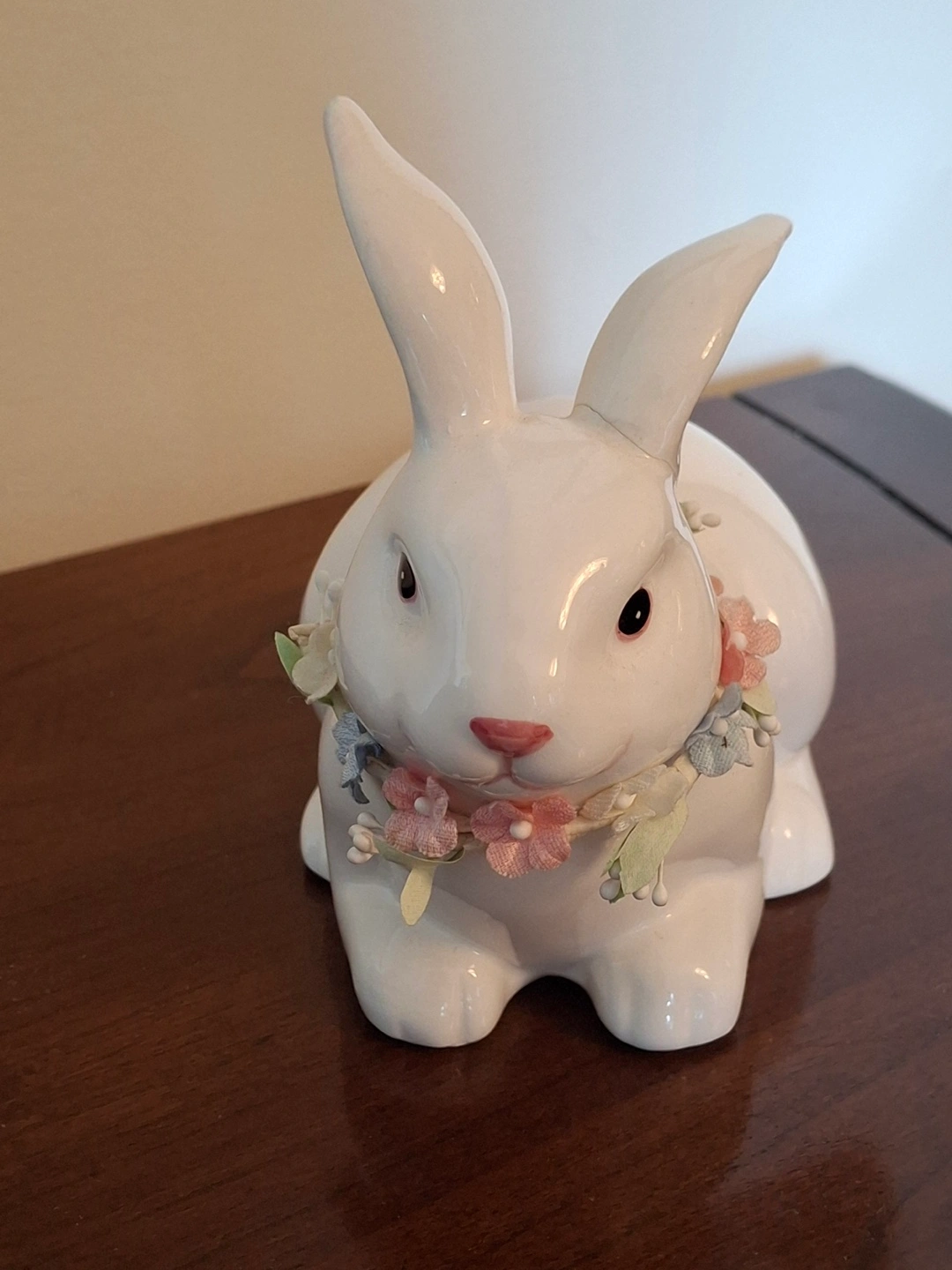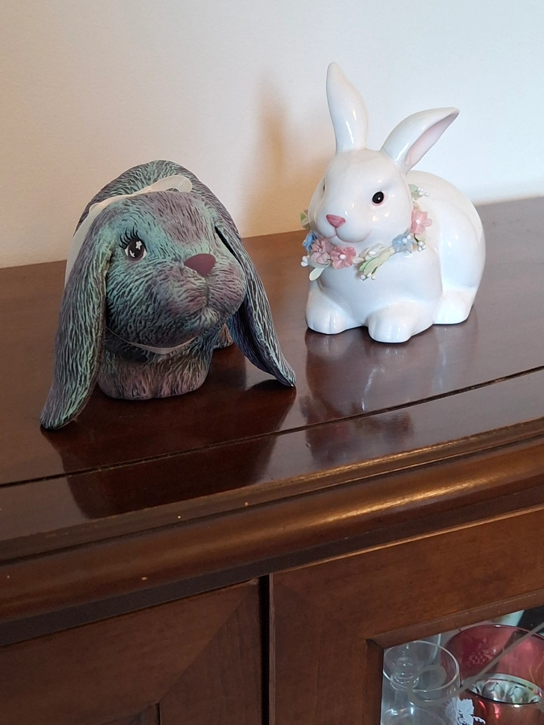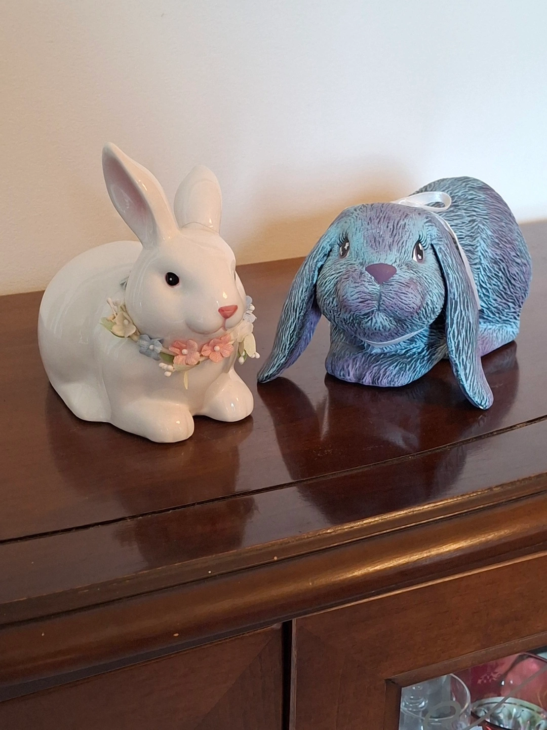 Two adorable bunny figurines. Larger darker bunny, no brand or marking. 7” Smaller white one, Russ made in the Philippines. 5.5” Price is per item. Available for pickup in Markland Wood.