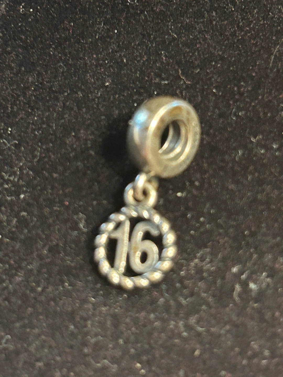 Here's a cute silver charm featuring the number 16! It's in great condition and would be a lovely addition to any charm bracelet or necklace