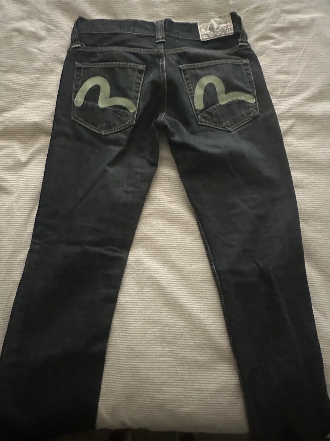 Selling a pair of Evisu jeans in a dark wash. They feature the iconic seagull logo on the back pockets. They are in used condition. Size 30/32
